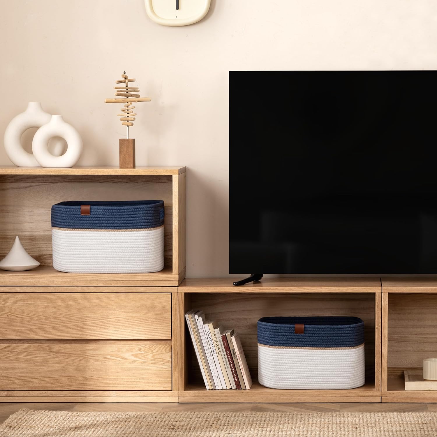 UBBCARE 4 Pack Baskets for Organizing, Woven Storage Baskets with Label for Toys and Towel, Rectangle Cotton Rope Basket with Handles, 15''L x10''W x9''H, Navy Blue&White