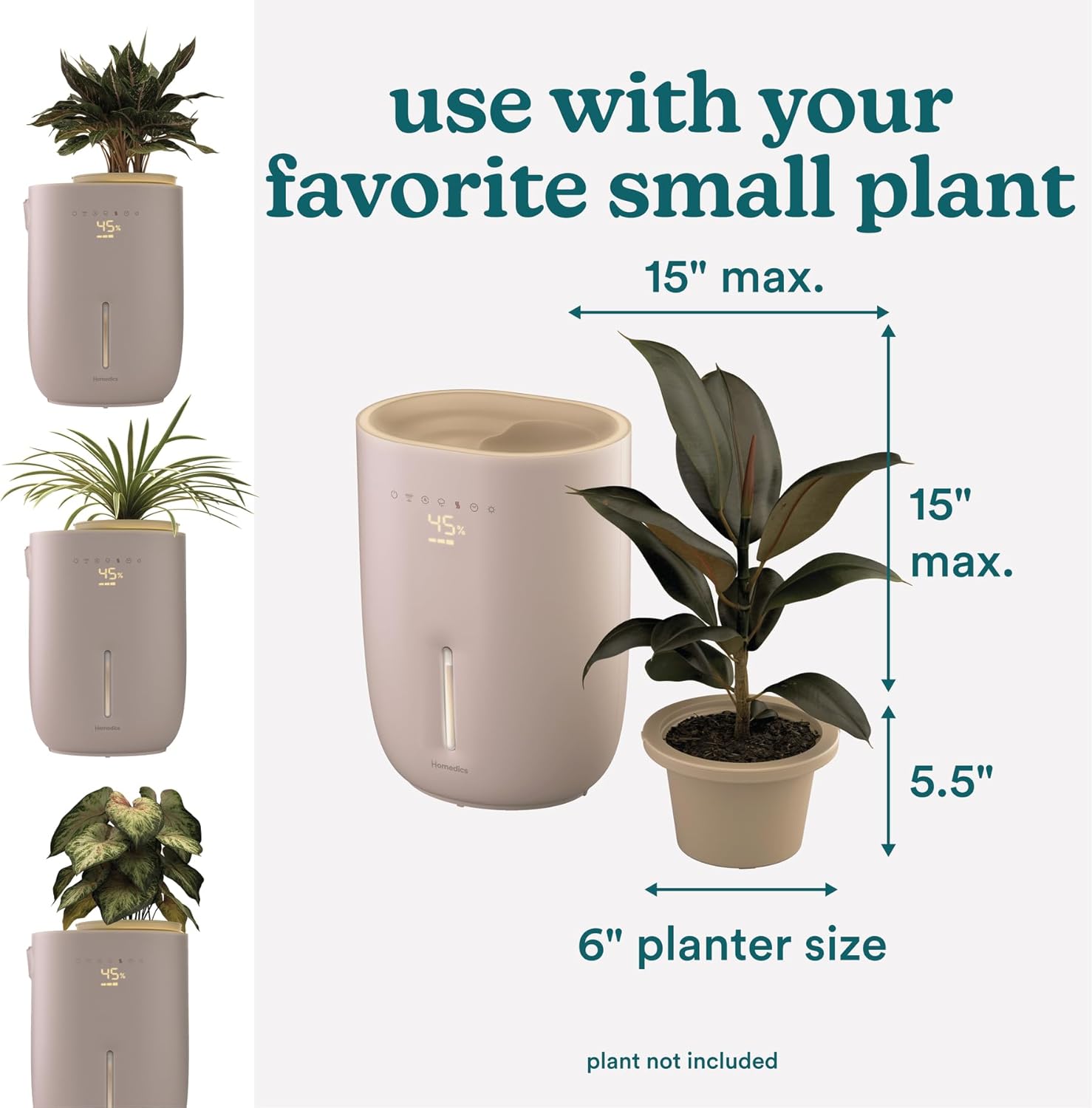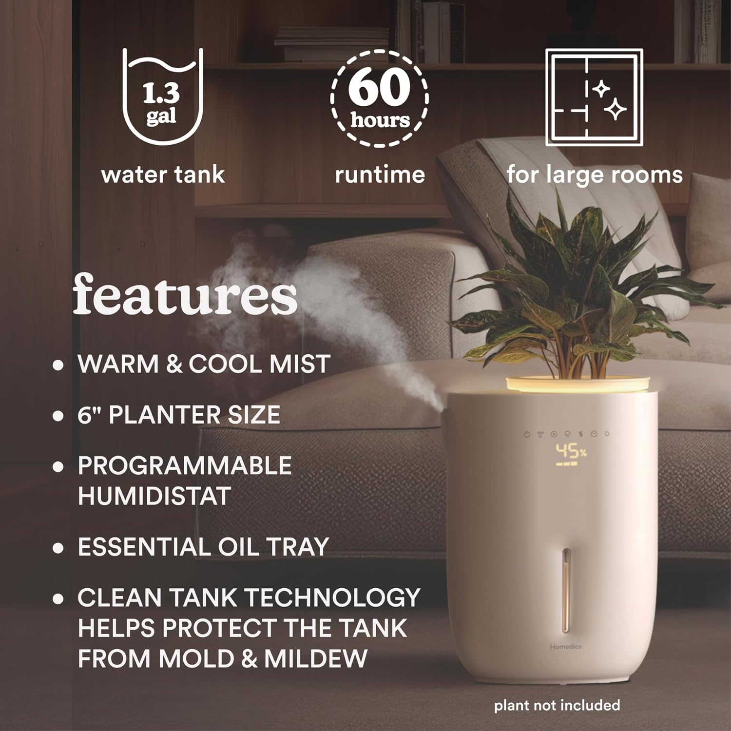 Homedics Natura Ultrasonic Warm & Cool Mist Humidifier, 1.3-Gal for Large Rooms, 60-Hr Runtime, Plant Holder, Programmable Humidity, Auto Shutoff, Nightlight Small Plant Compatible(Plant Not Included)