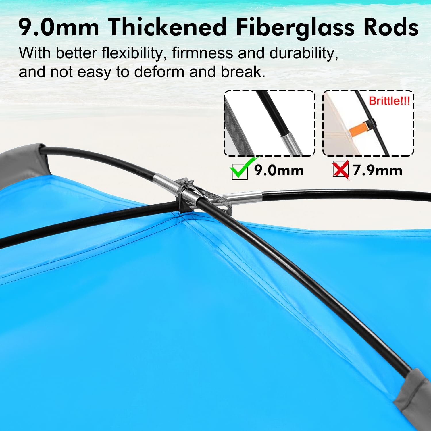 - 9.0mm Thickened Fiberglass Rods: We increased the thickness of the fiberglass rods to 9.0mm to make it more flexible, sturdy and durable. It can support the tent more stable and will keep shape even after long time use.