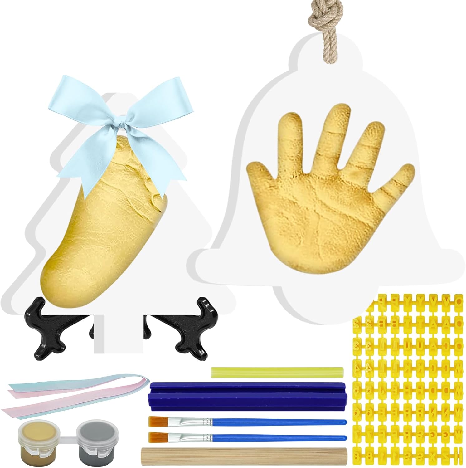 - Set Includes:Two pieces of air dried clay, roller, straw, 2 paint brushes, 2 ribbons, additional custom template kit, 2 display stands, 2 colors of paint.Grey and gold.Everything you need to make beautiful, lasting footprints or paw prints souvenir ornaments to display on your mantel or hang on your Christmas tree.