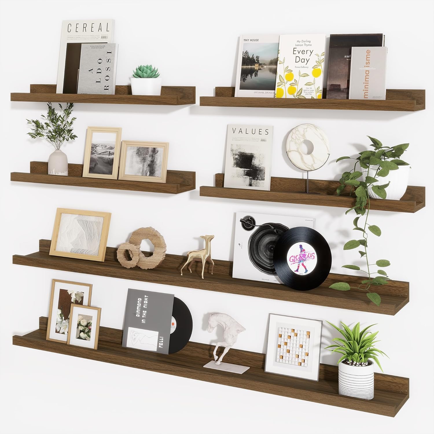 - Picture Wall Collage Decor: Do you have a lot of memorable photos, but don't know how to display them, our wood floating shelves are perfect for you! We offer 6 shelves, you can mix and match colors, height, length, and symmetry. With our long wall shelf set, your dull space will be transformed into wall art