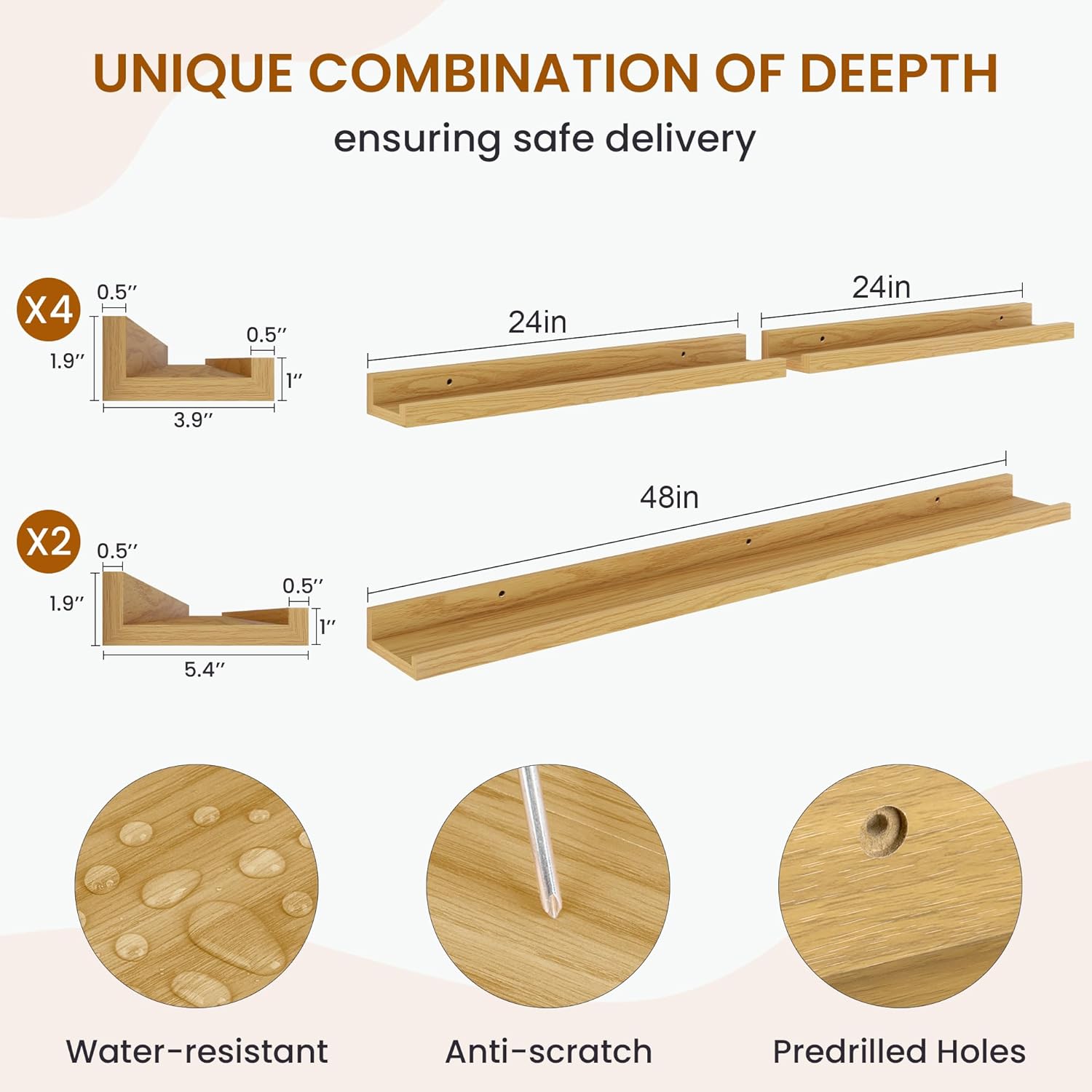 Axeman Picture Ledge Shelf, Floating Shelves for Wall Decor Storage Set of 6, 48 inch Floating Wall Mounted Shelves, Shelves with Lip for Living Room, Bedroom, Nursery, Bathroom, Kitchen, Oak