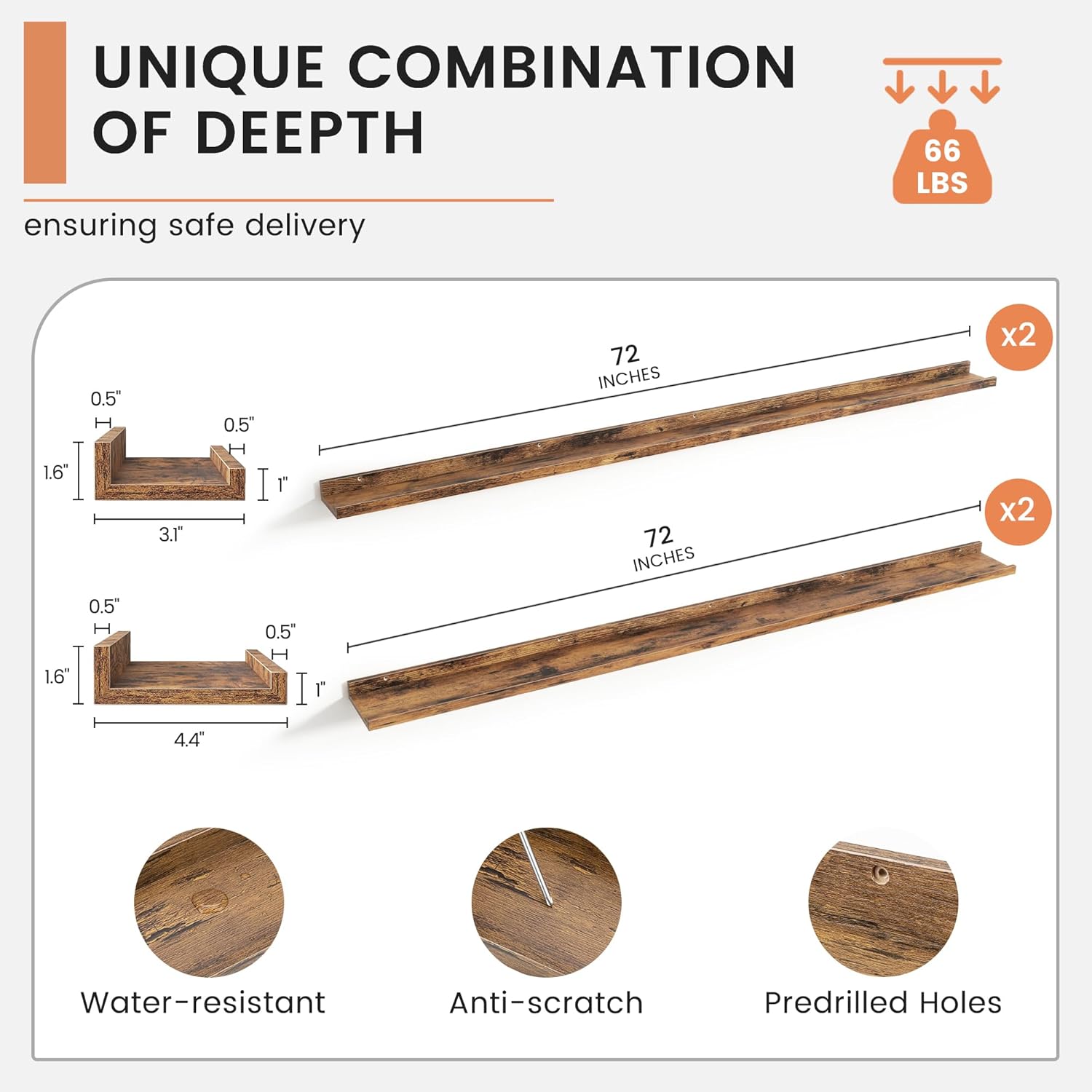 Floating Picture Ledge Shelves for Wall Set of 4, 72 Inch Wall Shelves with Lip Long Large Nursery Book Shelf for Toys Storage Kids Bookshelf Wall Mounted Living Room Bedroom Decor Frames