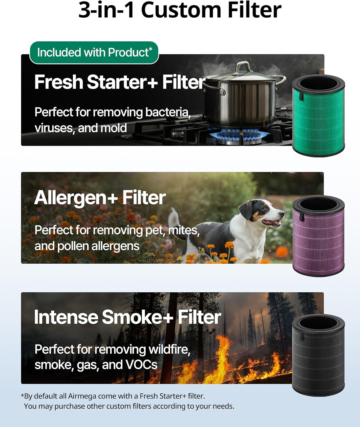 - PERSONALIZED AIR CARE Tailor your air purification experience to your needs with a custom 3-in-1 filter. Fresh Starterplus for unwanted VOCs, and odors. Allergenplus for pollen, dust mites, fungi, and pet dander. Intense Smokeplus for wildfires, pollution and industrial fumes.