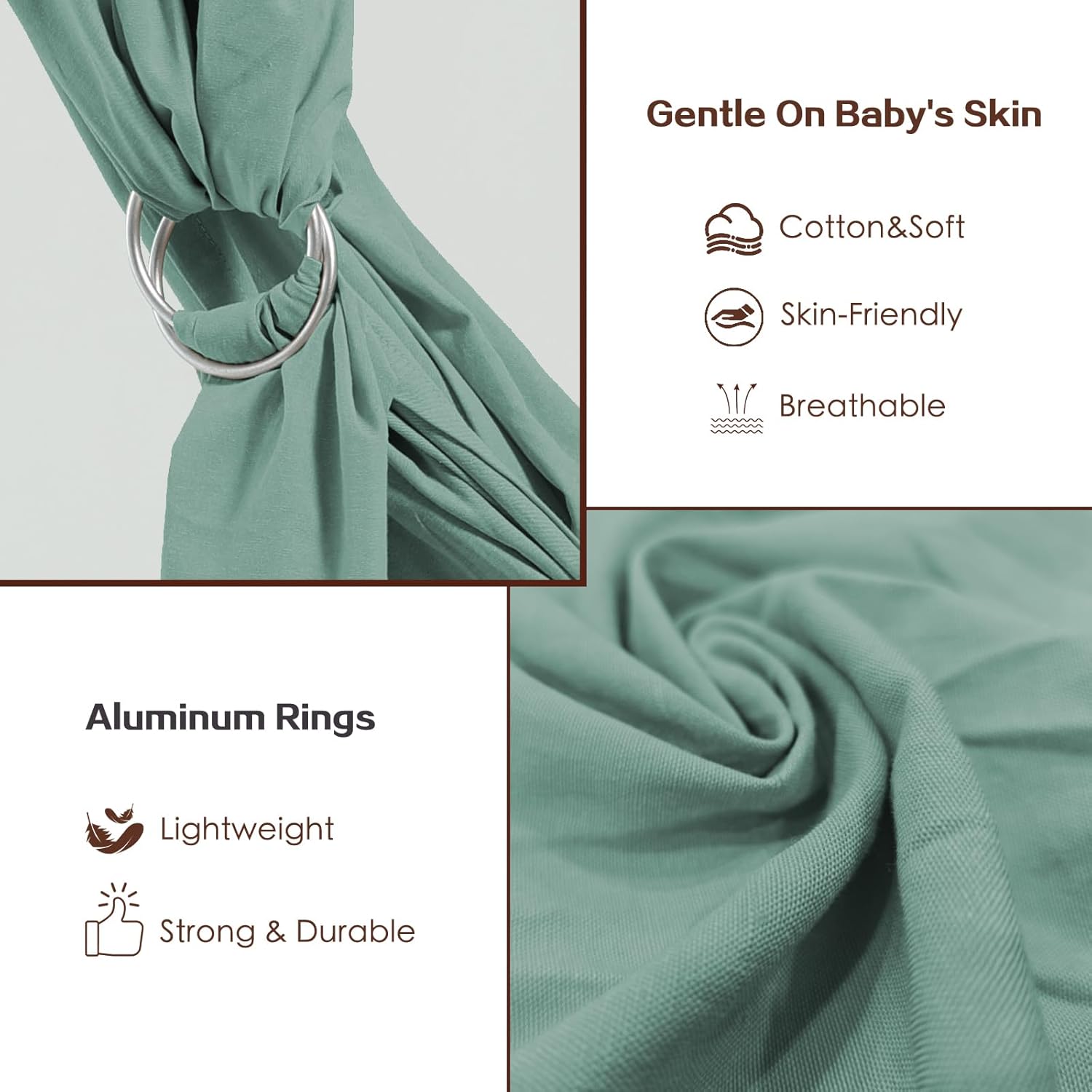 - 【More Reliable, More Secure】The baby wrap ring sling features a unique, safe & durable design. The lightweight yet sturdy aluminum rings, it's highly durable, bearing the baby's weight without deformation over time. The toddler sling has passed the US CPSC safety certification to ensure that each sling meets strict safety standards and provides a full range of care for the baby.