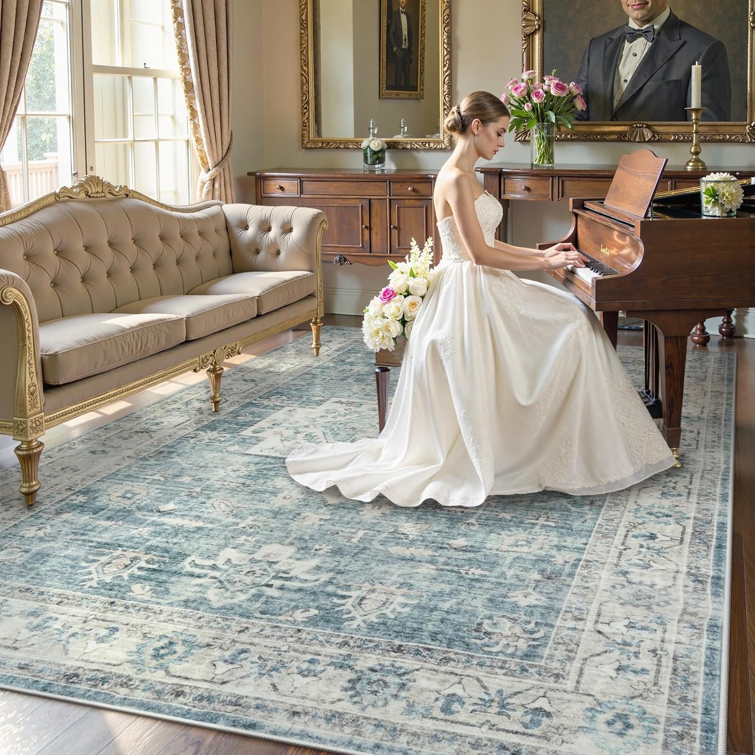 LIVEBOX Washable Area Rug 9x12 Rugs for Living Room Bedroom, Non-Slip Boho Indoor Carpet for Dining Room Office, Low-Pile Farmhouse Soft Carpets for Kids Nursery Room Playroom, Blue