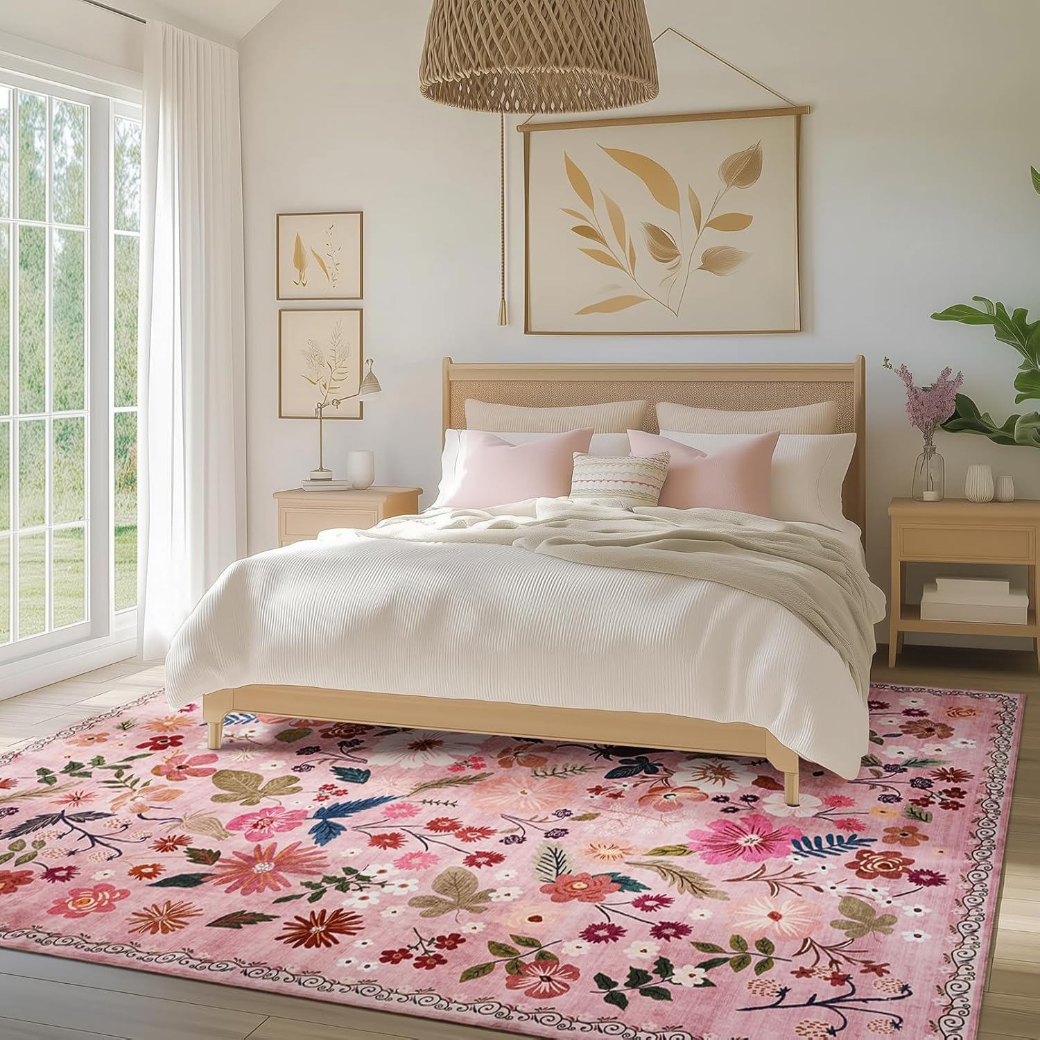 Living Room Rug 6x9 Washable Boho Floral Non Slip Large Aesthetic Pink Area Rugs Vintage Soft Low Pile Stain Resistant Sound Absorbing Big Carpet Rug for Bedroom Dining Room Kids Nursery Girls Dorm