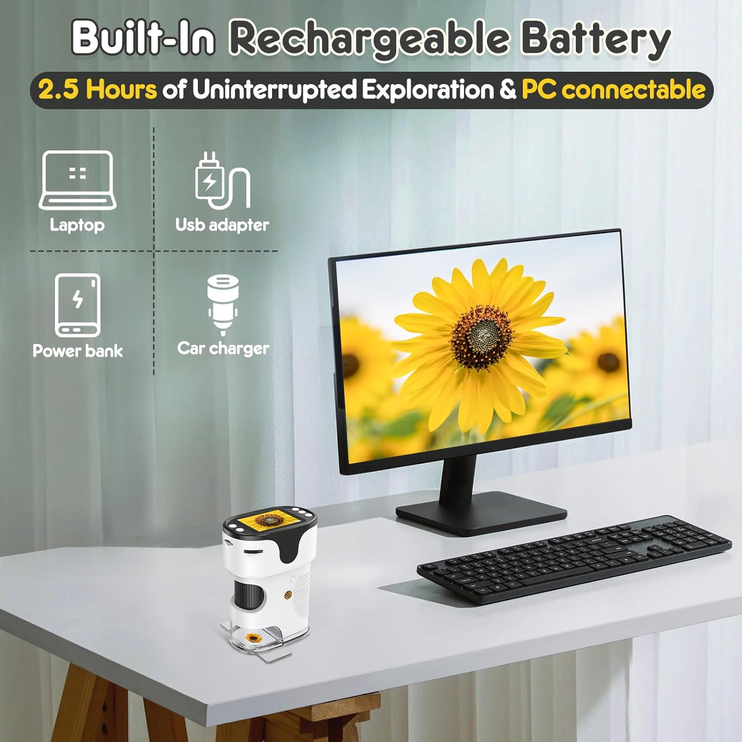 1000X Handheld Microscope for Kids 4K 2.0" Screen Rechargeable Mini Pocket Digital Microscopes w/Slides Kit Portable Edu Gift Age 4-6 8-12 Children Students (White)