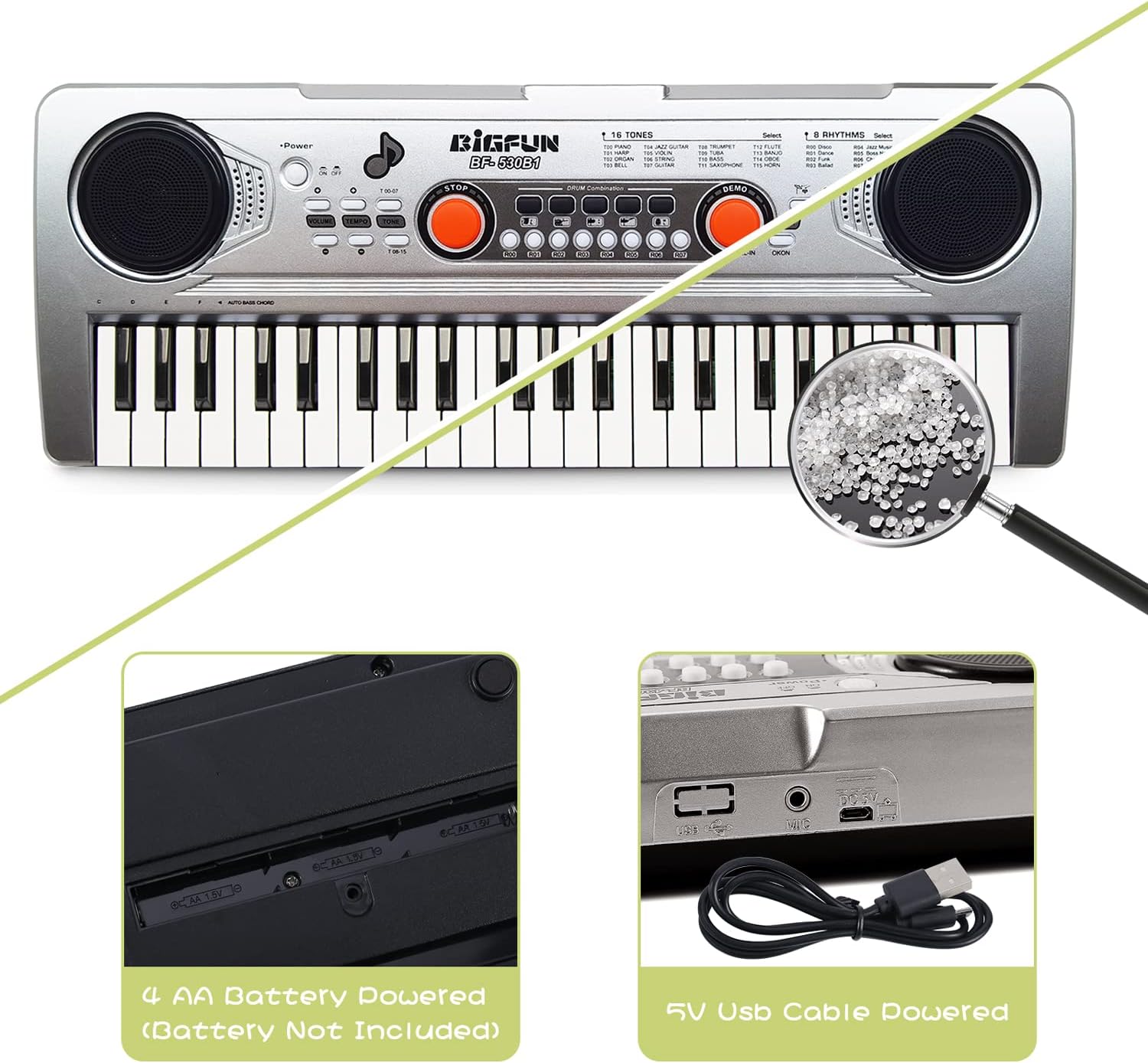 - 【Flexible Power Options】This keyboard piano can be powered by either 4 AA batteries (not included) or a USB power cable provided in the package, giving you the freedom to choose. The exceptional quality speaker delivers stereo sound that is both realistic and engaging, enhancing the overall playing experience for children.