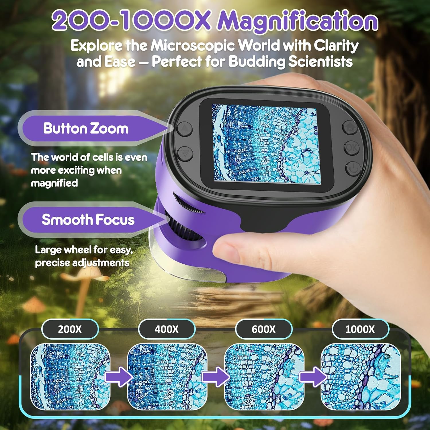 1000X Handheld Microscope for Kids 4K 2.0" Screen Rechargeable Mini Pocket Digital Microscopes w/Slides Kit Portable Edu Gift Age 4-6 8-12 Children Students (Purple)