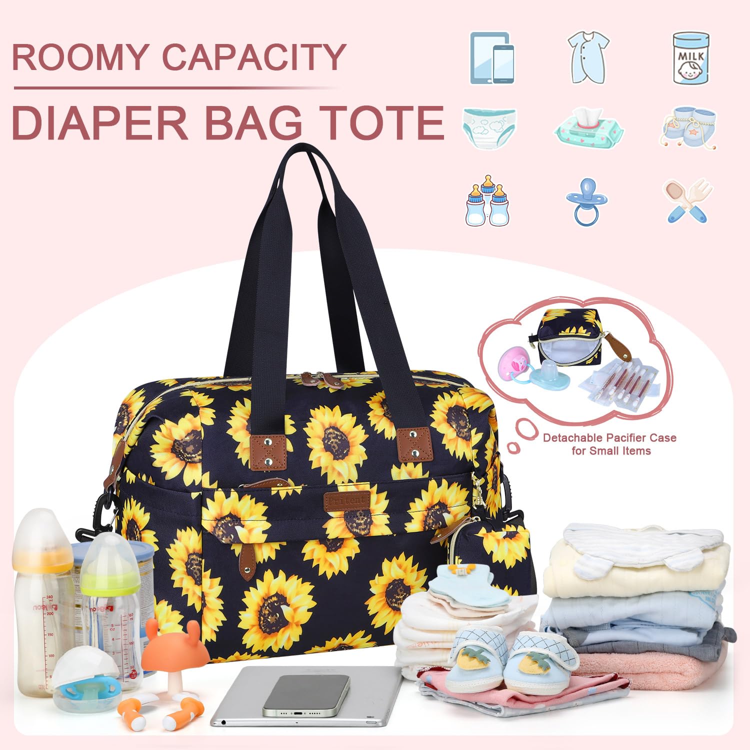- All in One Diaper Baby Bag: Designed with multiple specialized pockets, pacifier case and easy-to-reach bottle compartments, Pritent diaper bag tote can also function as a hospital overnight maternity bag for labor and delivery, travel tote bag, stroller organization, crossbody / messenger bag, handbag.
