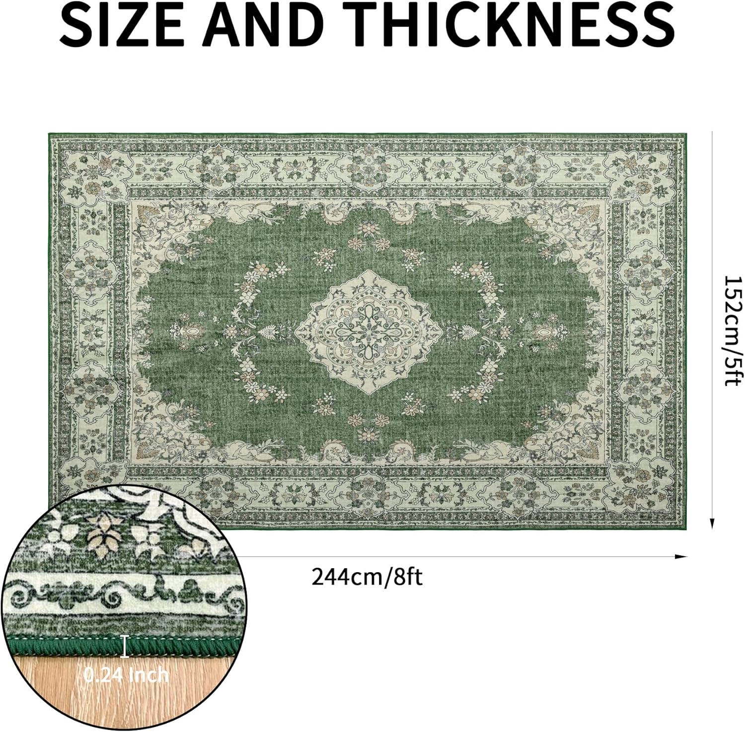 5x8 Area Rug Washable: Oriental Soft Area Rug for Living Room Bedroom No Shedding - Low Pile Thin Carpet Rug for Dining Room Non Slip - Boho Vintage Rug for Home Decor - Olive Green