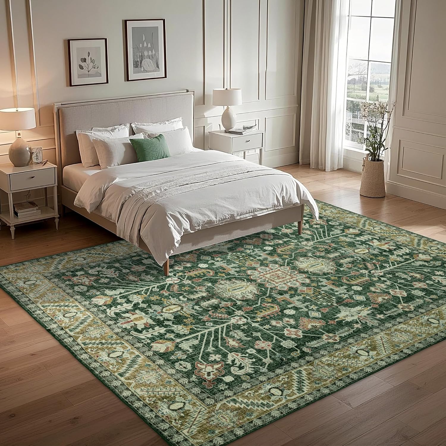 9x12 Area Rug Washable: Oriental Soft Area Rug for Living Room Bedroom No Shedding - Low Pile Thin Carpet Rug for Dining Room Non Slip - Boho Vintage Rug for Home Decor - Retro Forest Green