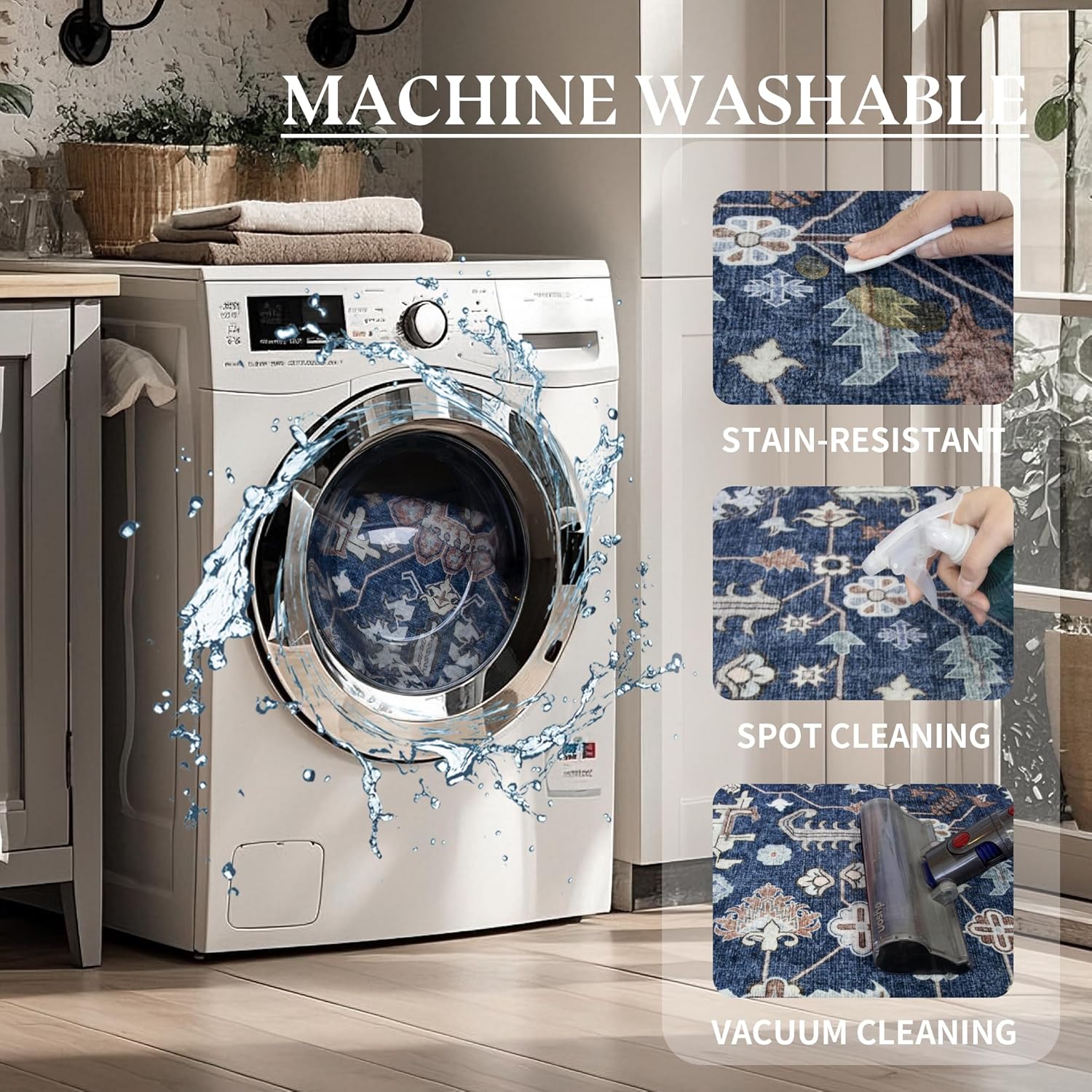 6x9 Area Rugs Washable: Oriental Soft Area Rug for Living Room Bedroom No Shedding - Low Pile Thin Carpet Rug for Dining Room Non Slip - Boho Vintage Rug for Home Decor - Navy Blue