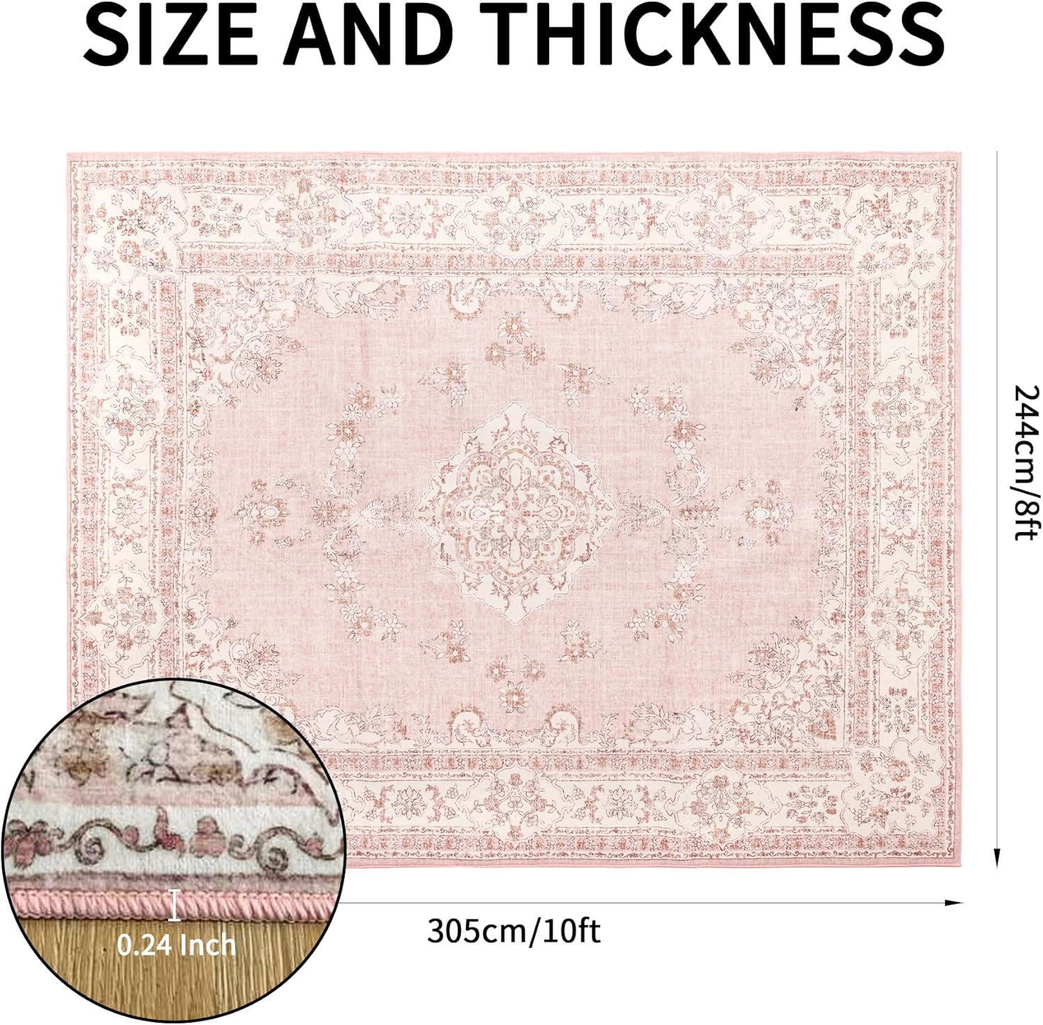 8x10 Area Rugs Washable: Oriental Soft Area Rug for Living Room Bedroom No Shedding - Low Pile Thin Carpet Rug for Dining Room Non Slip - Boho Vintage Rug for Home Decor - Soft Pink