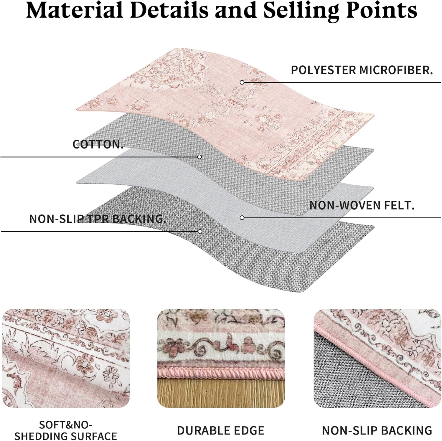 5x8 Area Rug Washable: Oriental Soft Area Rug for Living Room Bedroom No Shedding - Low Pile Thin Carpet Rug for Dining Room Non Slip - Boho Vintage Rug for Home Decor - Soft Pink