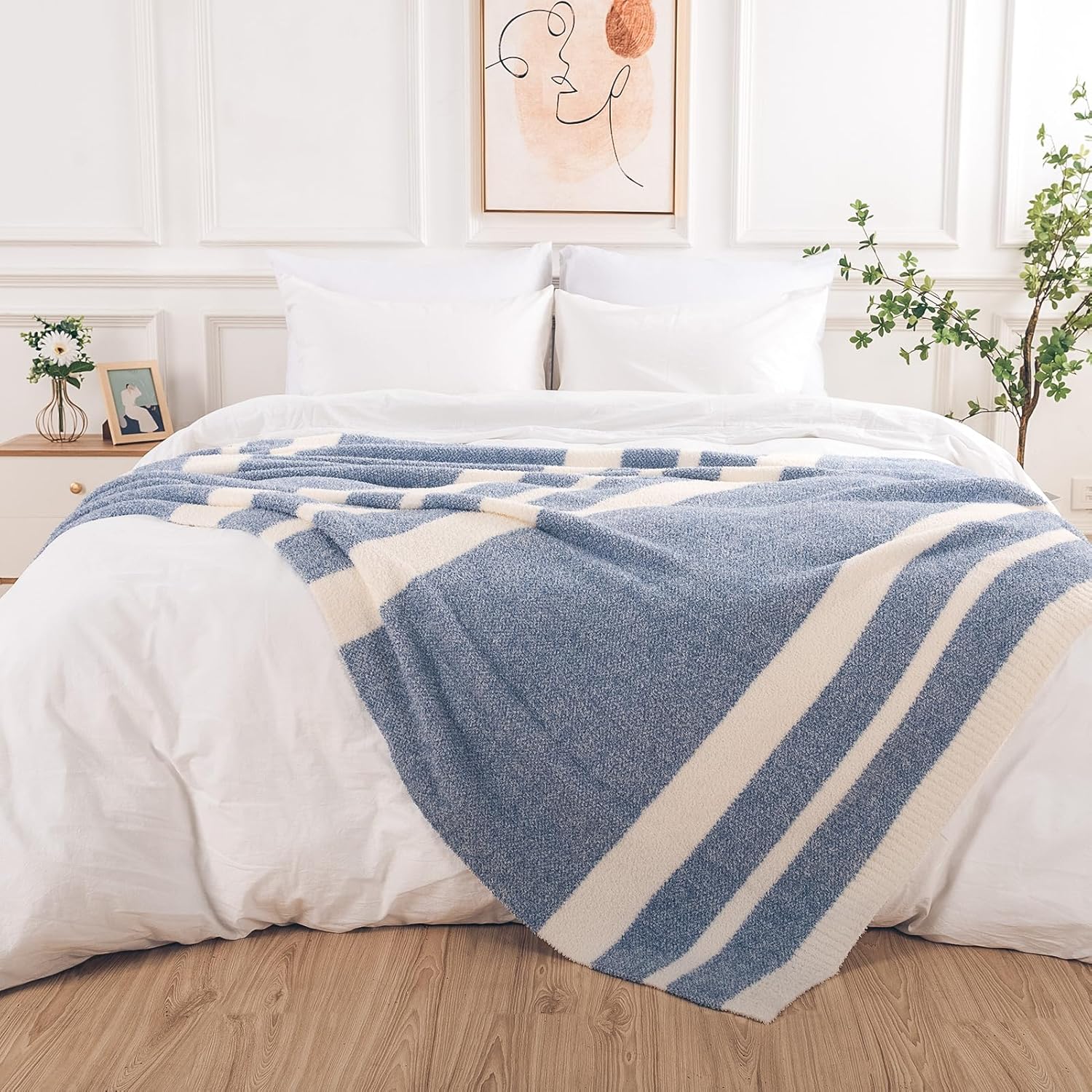 NEXHOME PRO Stripe Cozy Blanket, Knit Fuzzy Throw Blanket for Couch Bed Sofa Picnic, Ultra Soft Blankets for Women Gifts Blue 50 x 60 inches