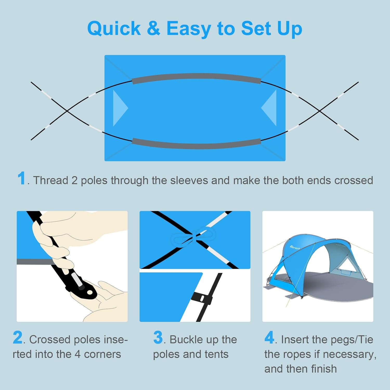 - Stable and Durable Construction: Equipped with sturdy 11mm thickened poles, 4 sandbags (2 on each side), 12 stakes (including 4 ground stakes and 8 plastic stakes), and 4 wind ropes, the tent can withstand 3-4 level wind forces to remain stable and secure, ensuring reliable windproof performance for your beach adventures