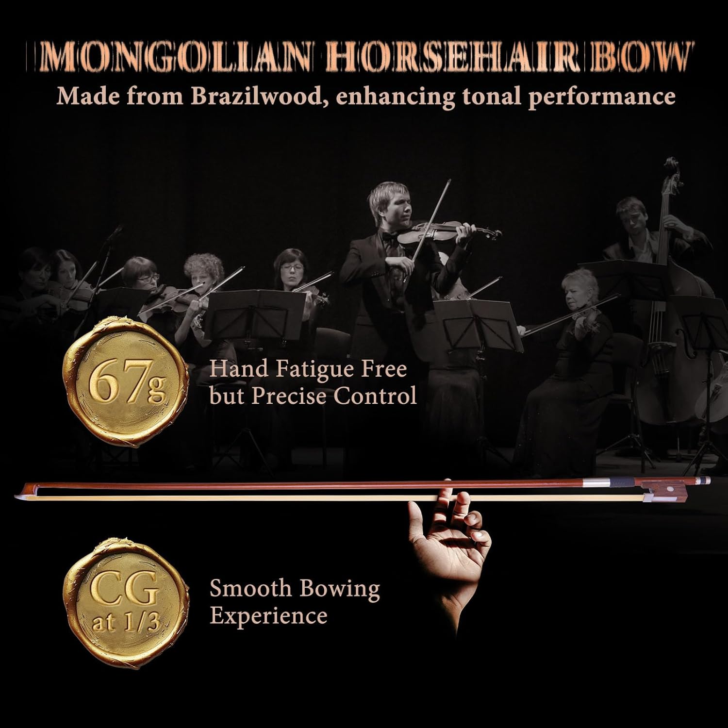 - 【Ergonomic Bow Design | 67g Precision Balance】Brazilwood shaft with Mongolian horsehair features a 23cm forward-weighted balance point, reducing wrist strain by 57% during 3+ hour sessions. Engineered for Paganini-level virtuosity—ideal for competition pieces and intricate bowing techniques.