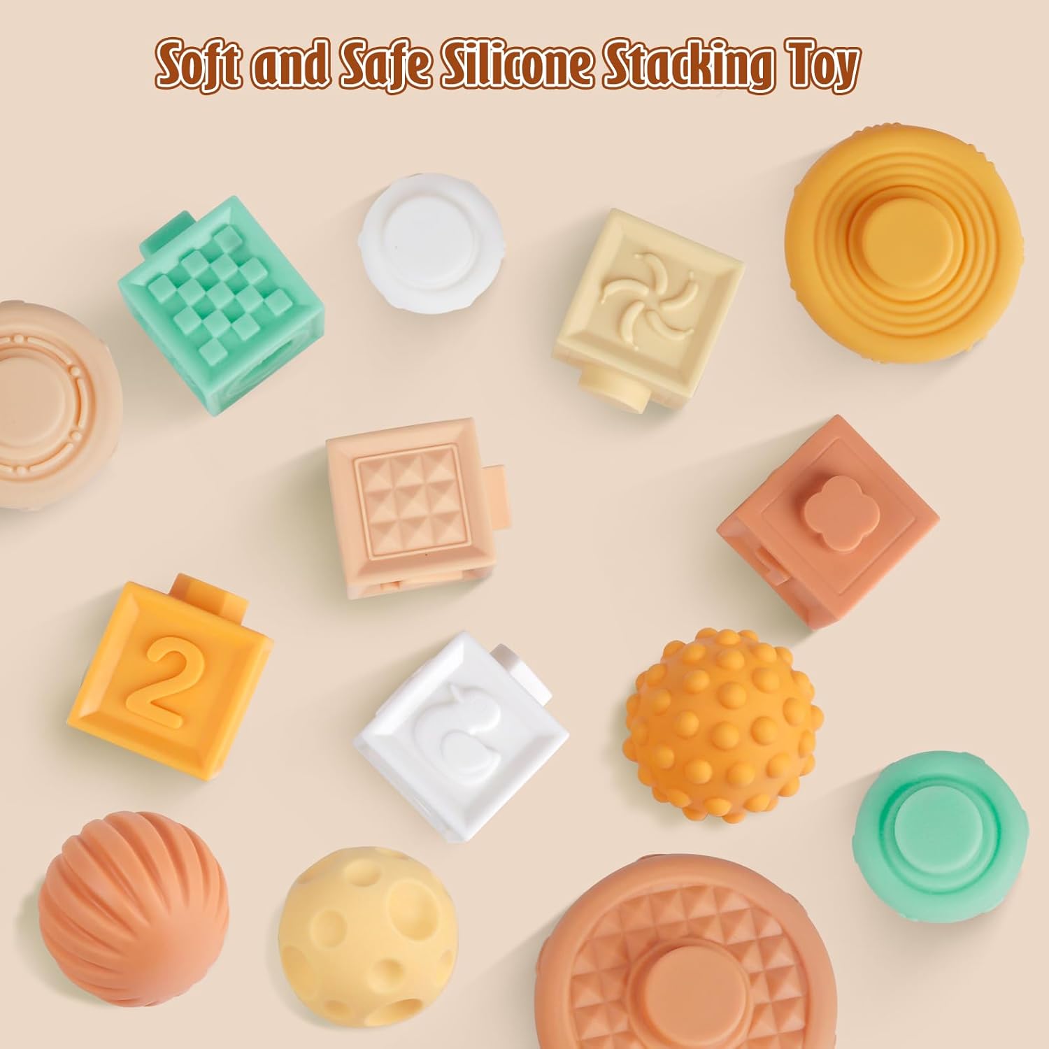 - Montessori Early Learning Toys: Designed for toddlers 6 - 12 months, embossed design building blocks and stacking rings, with different relief patterns on each side, such as animals, fruits, arabic numerals, letter, geometric patterns and graphics. Children can observe these patterns through vision and touch, which contributes to intellectual development, thinking ability and practical ability