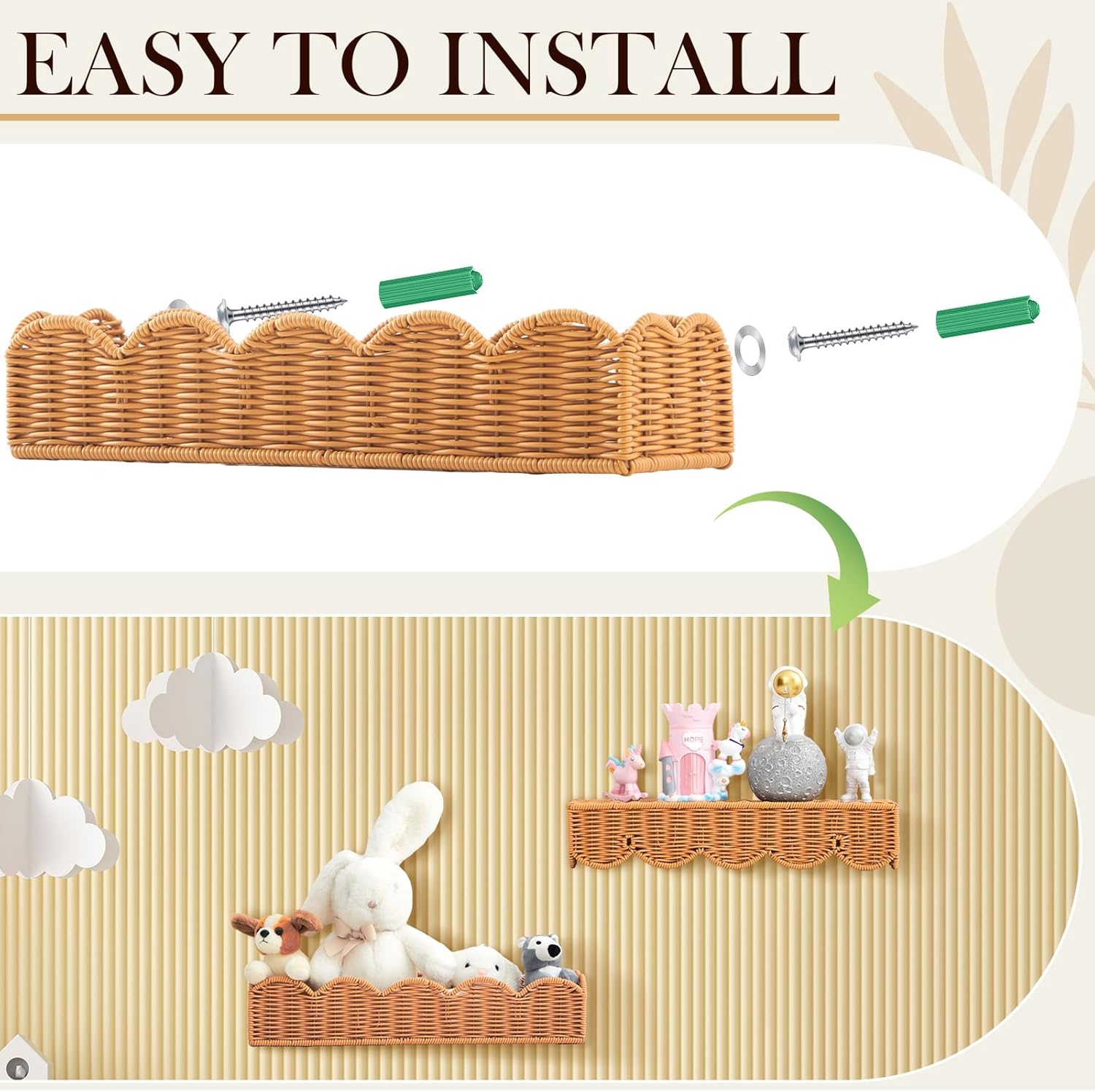 Pinkunn 3 Set Nursery Book Shelves Scalloped Rattan Wall Shelf 15.8 x 3.2 Inch Wall Mounted Plastic Floating Book Shelve, Hanging Boho Wicker Woven Shelf for Nursery Decor and Storage (Natural Wood)