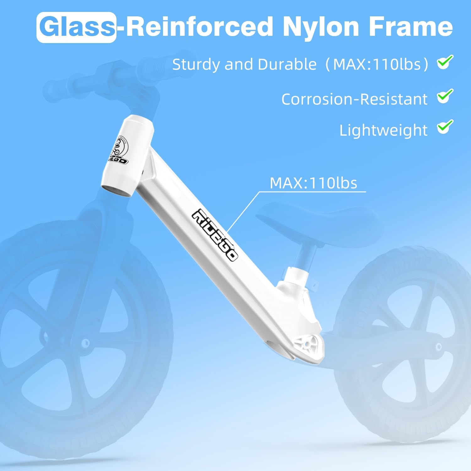 - 【LIGHTWEIGHT & DURABLE FRAME 】Built with a glass-reinforced nylon frame, this balance bike offers the same strength as carbon steel with a weight capacity of up to 110 lbs, while weighing only 8.16 lbs. It is also more corrosion-resistant and lightweight. Designed for long-lasting performance, it's easy for kids to handle and parents to carry.