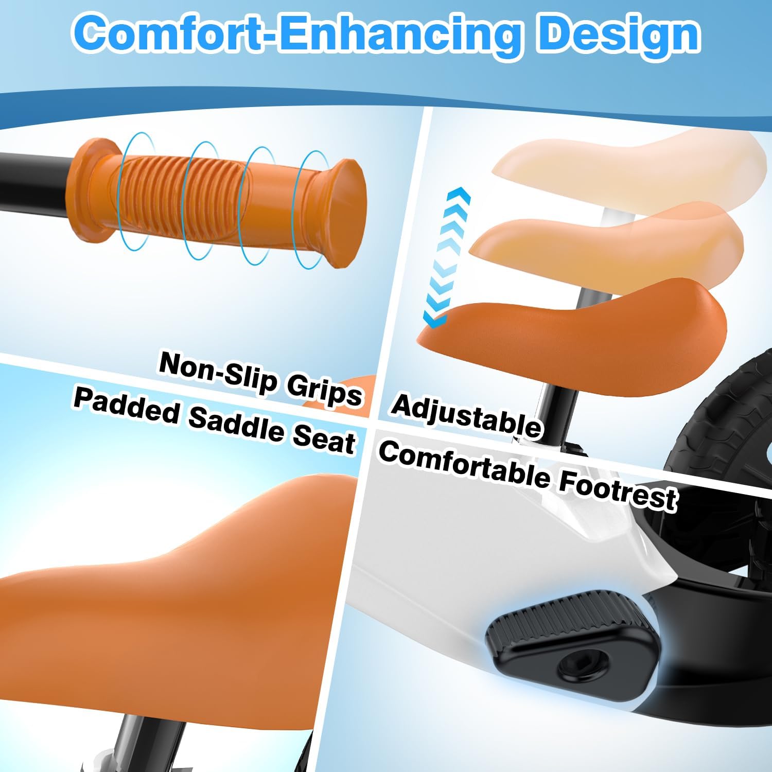 - 【THOUGHTFUL COMFORT DESIGN】 Featuring an adjustable seat height (12.2"–16.9") to grow with your child, a soft padded saddle, a footrest, and non-slip handlebars for enhanced control and comfort. Every detail is crafted to provide a fun and secure ride for balance bike 2+ years old and up.