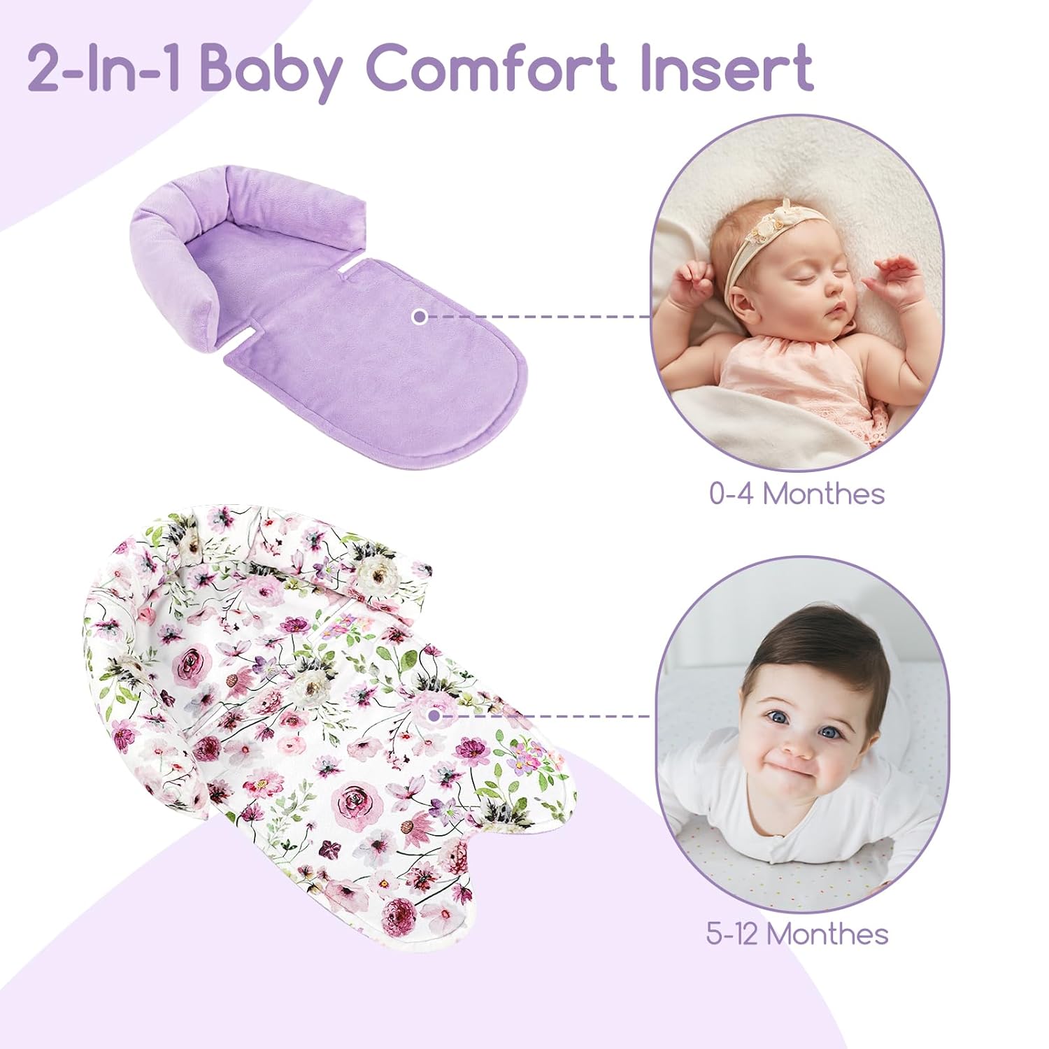 GFU Baby Car Seat Head Support for Newborn, 2 in 1 Infant Car Seat Head Body Support with Strap Pads, Soft Stroller Cushion Pillow Insert for Girls and Boys, Fits for Stroller, Swing, Purple Floral