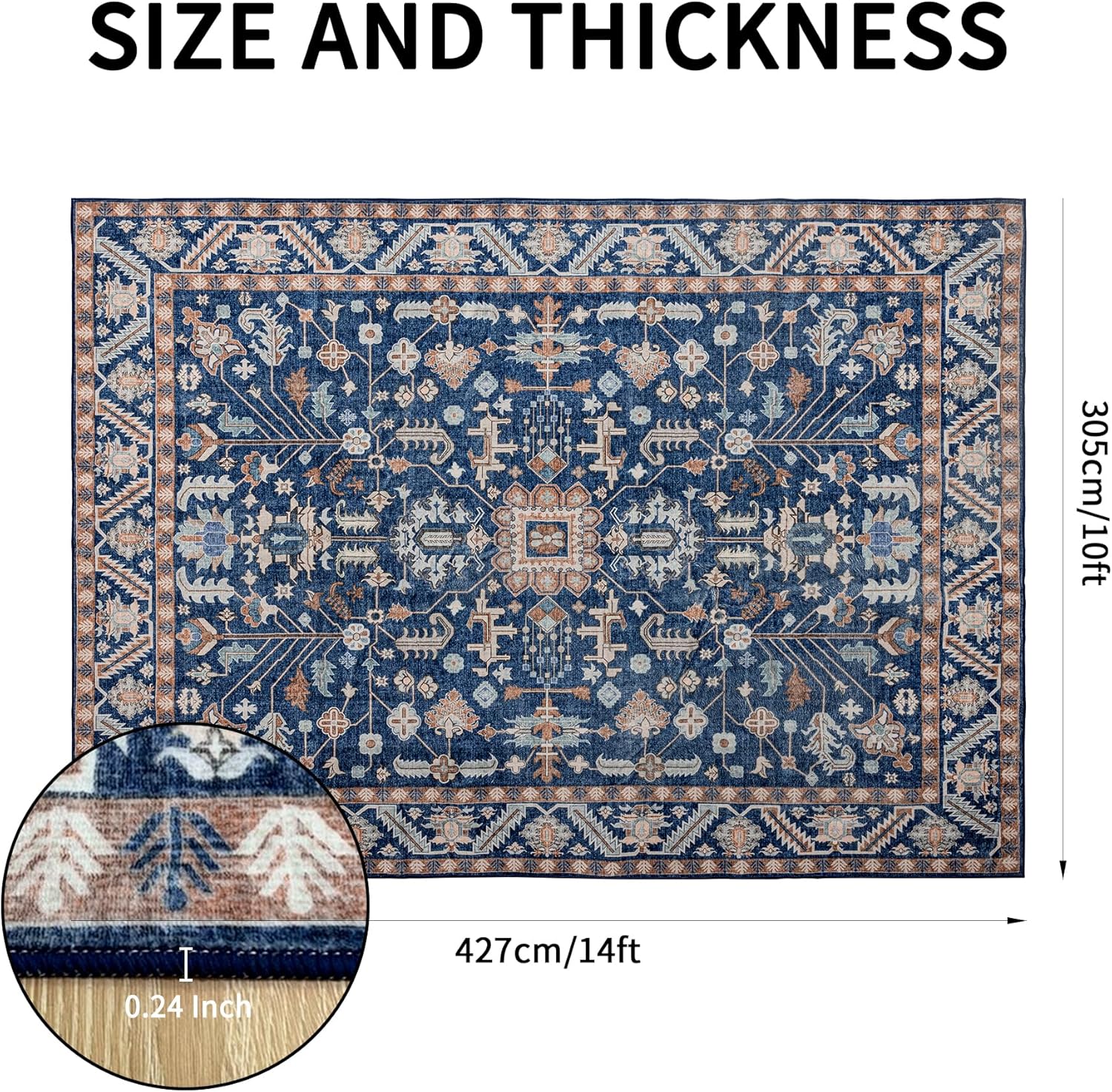 10x14 Area Rug Washable: Oriental Soft Area Rug for Living Room Bedroom No Shedding - Low Pile Thin Carpet Rug for Dining Room Non Slip - Boho Vintage Rug for Home Decor - Navy Blue