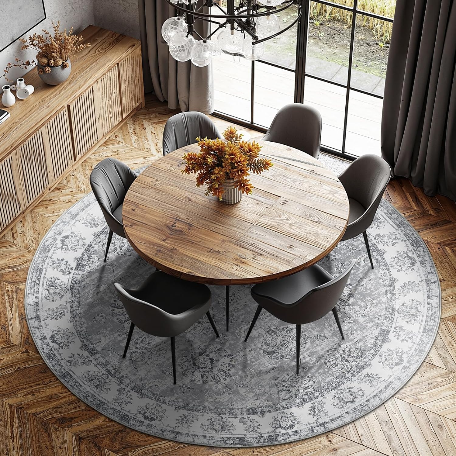 jinchan Round Rug 7ft Area Rug - Grey Vintage Floor Mat Kitchen Indoor Ultra-Thin Soft Floral Print - Washable Circle 7' Retro Accent for Farmhouse Non Slip Dining Room Living Room Bedroom Office