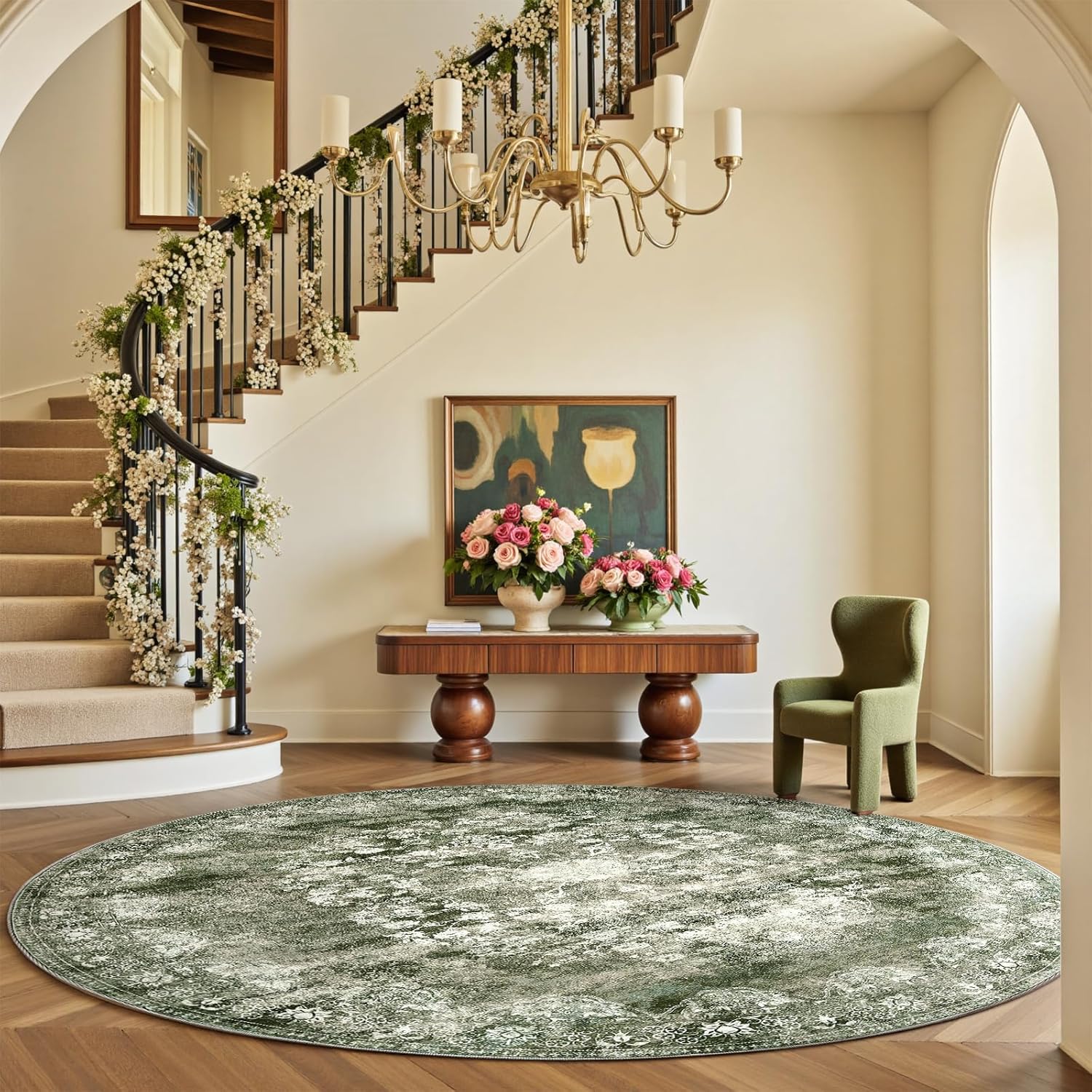 jinchan Round Rug 8ft Area Rug - Green Vintage Floor Mat Kitchen Indoor - Washable Circle 8' Thin Floral Print Carpet Retro Farmhouse Non Slip Dining Room Living Room Bedroom Office