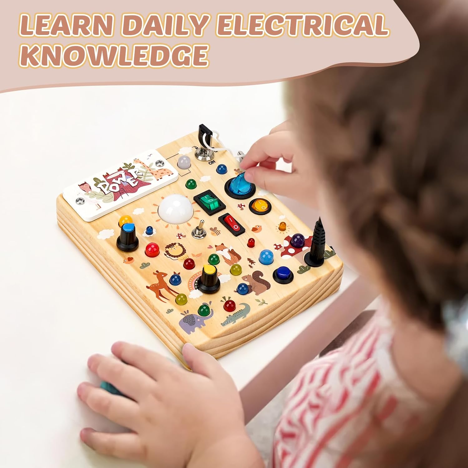 Joyreal Wooden Busy Board with LED Light, Montessori Toddler Toys, Wooden Sensory Board, Toddlers Activity Travel Toys for Boy & Girl Birthday Gift (Forest Theme)