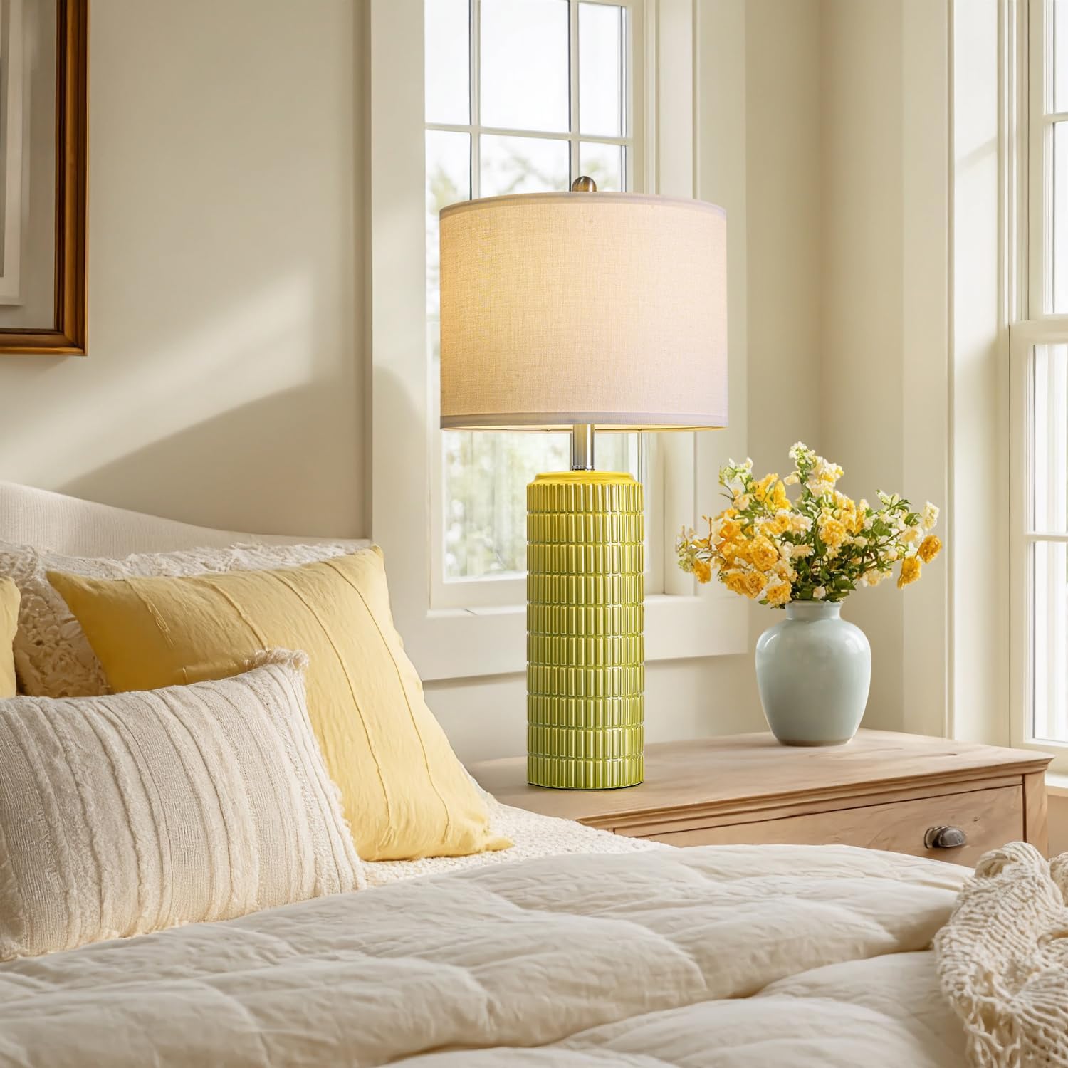 PoKat 27.5'' Tall Table Lamps for Living Room Set of 2, Mid Modern Century Ceramic Bedroom Lamps for Night Stands, Bedside Lamps for Bedroom, Nightstand Lamps for Side End Table Hallway, Green