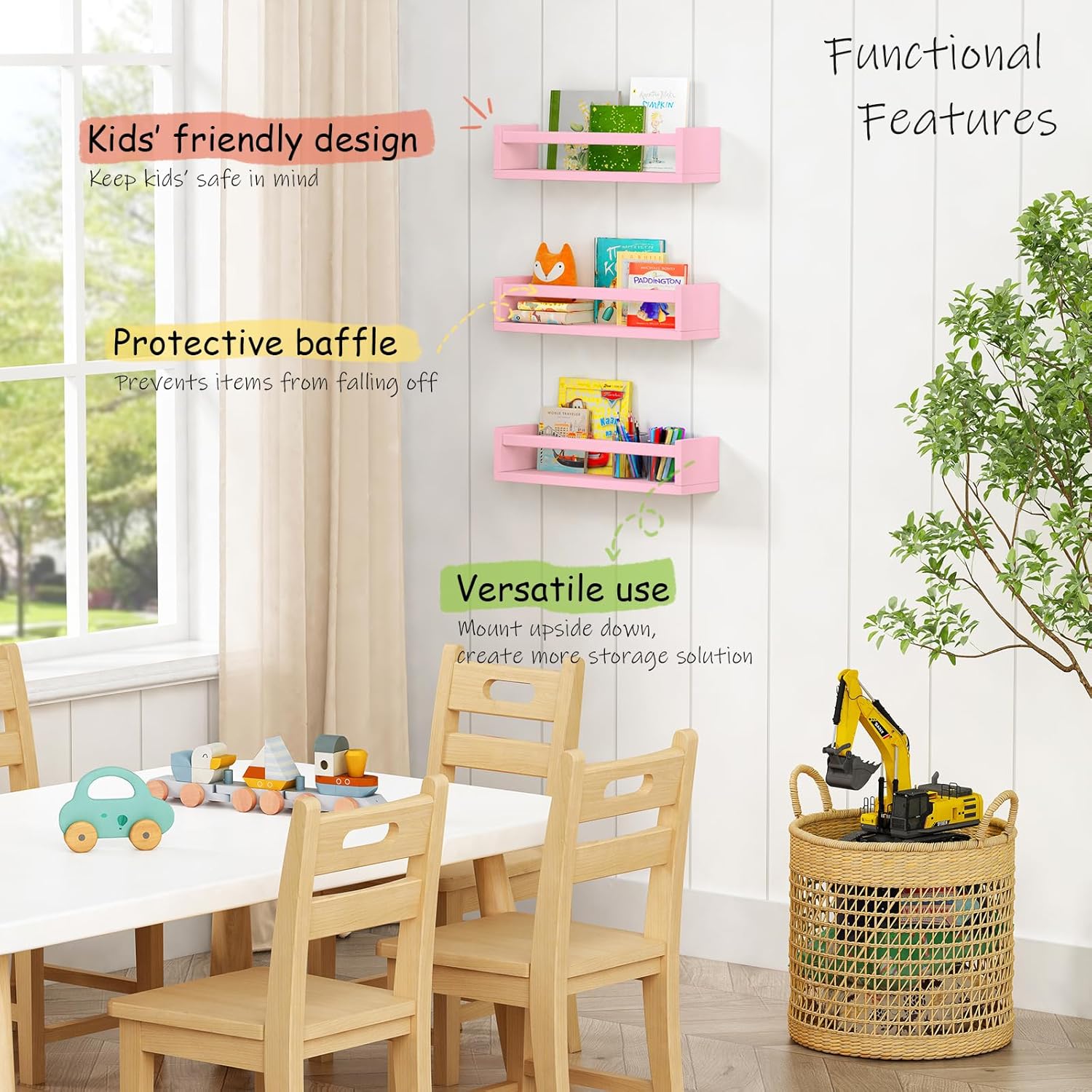 - [Versatile & Multifunctional] The pink floating nursery book shelves are no limit to creativity! Place them as wall bookshelf for kids’ room, baby book shelf for nursery, toddler book shelf and toy organizer for playroom, and it can even be used in the kitchen as a spice rack. Mount them upside down as kids clothes shelves in the bathroom and closet. They’re going to fit any space and any style thanks to their essential classic design.