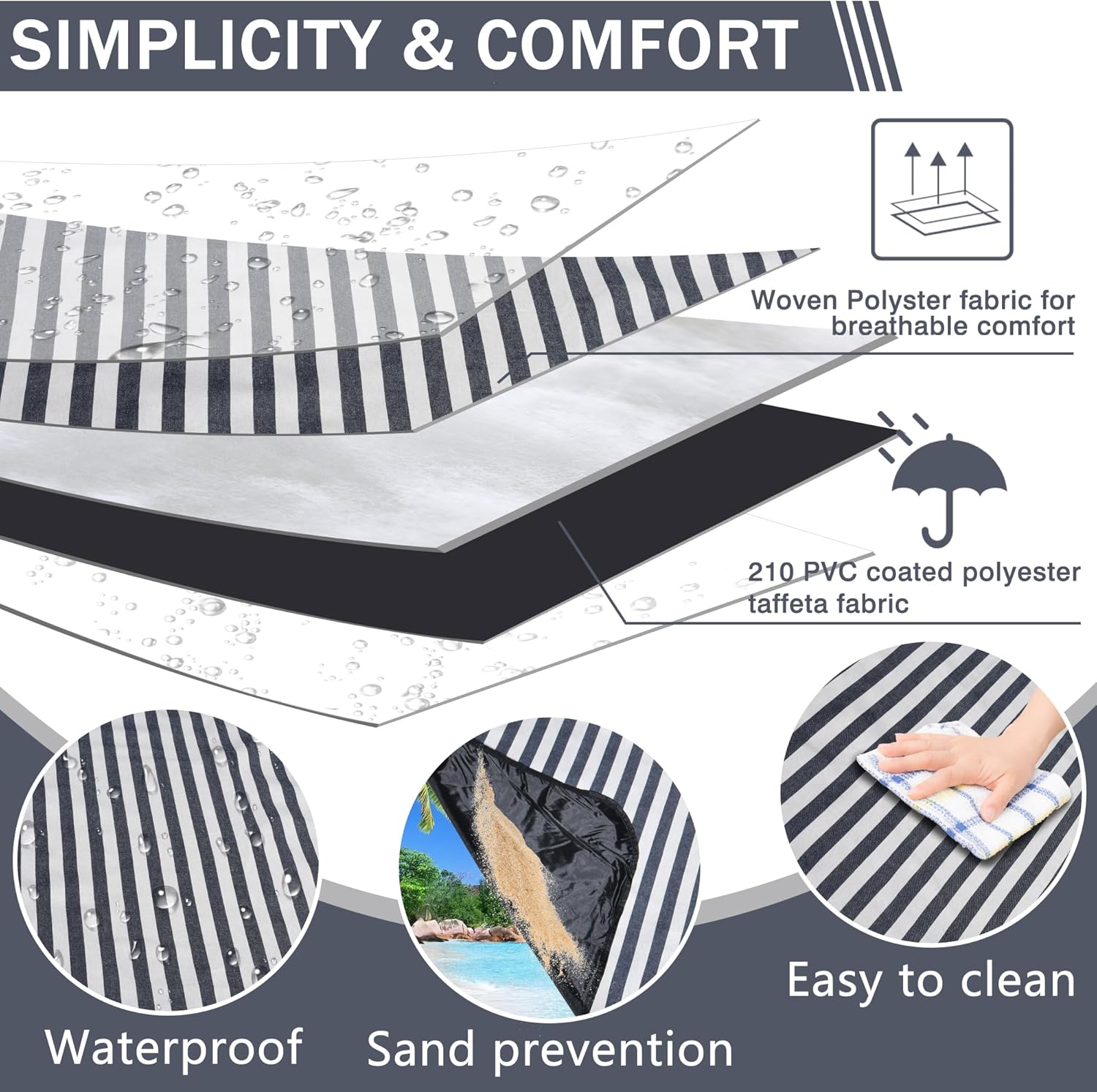 - Waterproof and Sandproof Picnic blanket: The picnic blanket is great choice for beach, park, or bleachers thanks to its PVC waterproof and sandproof backing. You can easily shake and wipe off dirt, wet grass and beach sand. The picnic blanket is designed to keep out the moisture and make you seat more comfortable.