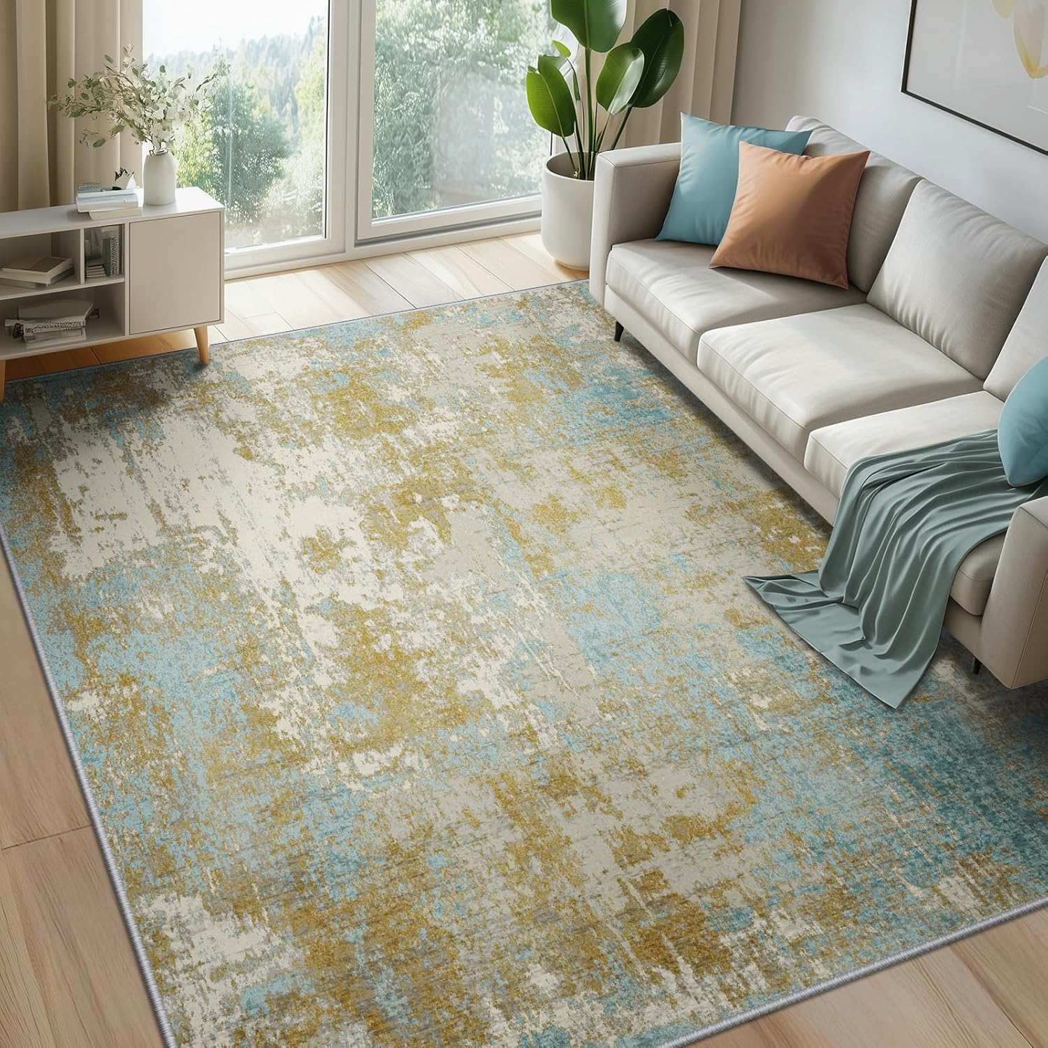 Washable Area Rugs 6'x9' Non-Slip Modern Abstract Soft for Living Room Entryway Bedroom Nursery, Print Pattern, Teal Blue Taupe
