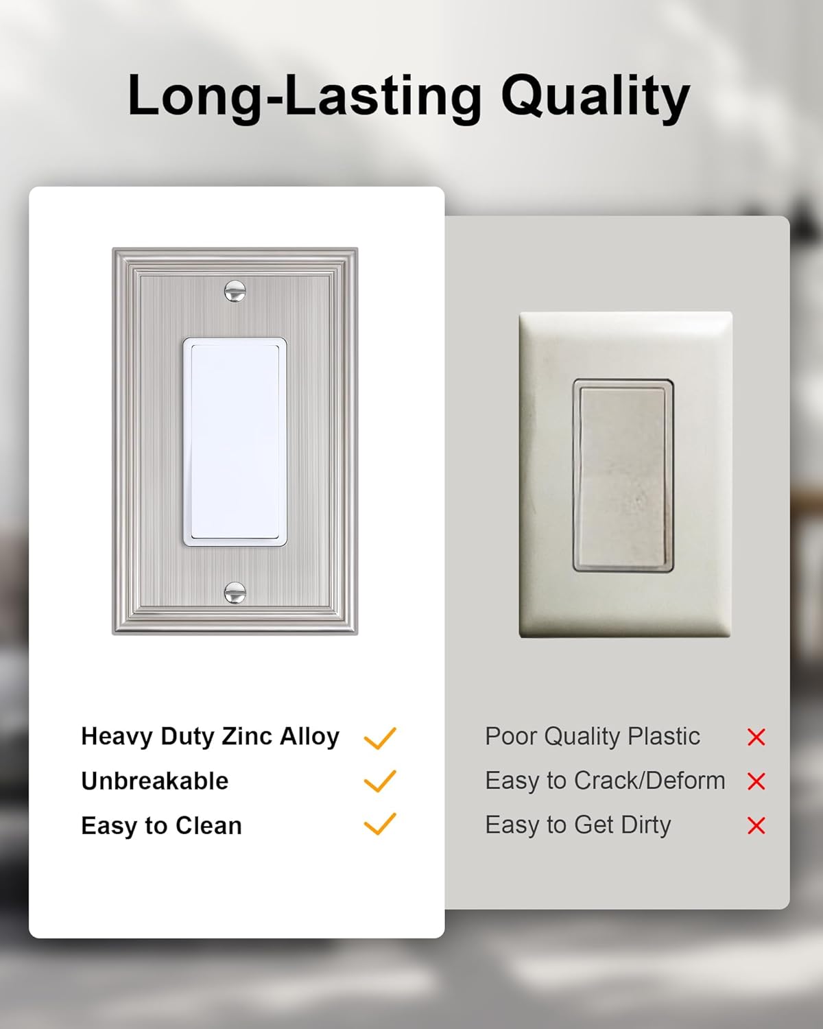 - Elevate Your Decor - The brushed nickel wall plate boasts simple, clean, and elegant lines with brushed texture. Its sleek and modern design, adds a touch of elegance and a refined decorative accent to any room, seamlessly integrating into any decor style and providing a timeless yet sophisticated look that will make your decor stand out.