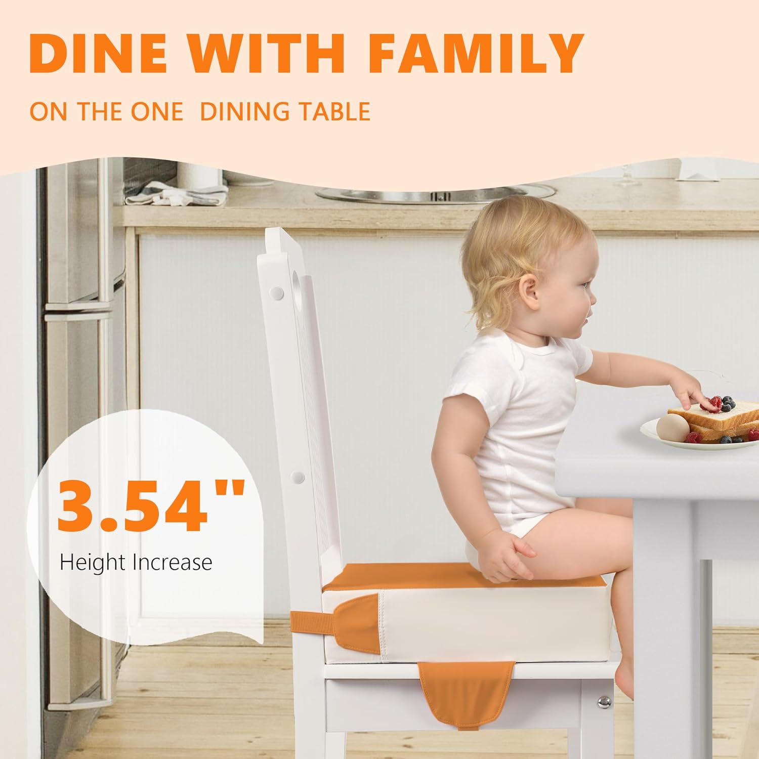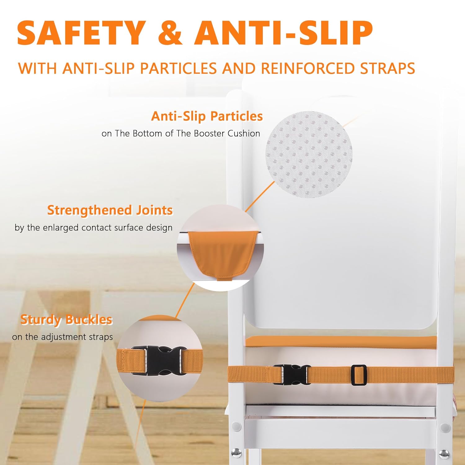 - 【Safety & Anti-slip】The booster seat for table features anti-slip particles and reinforced straps. The anti-slip particles provide excellent resistance to prevent the seat from sliding on the surface of the chair. This ensures your baby stays firmly in place while sitting. The straps add an extra layer of safety, keeping the seat securely fixed to the chair and minimizing the risk of movement. Your baby will be very safe and stable during mealtime or any other activity at the kitchen table.