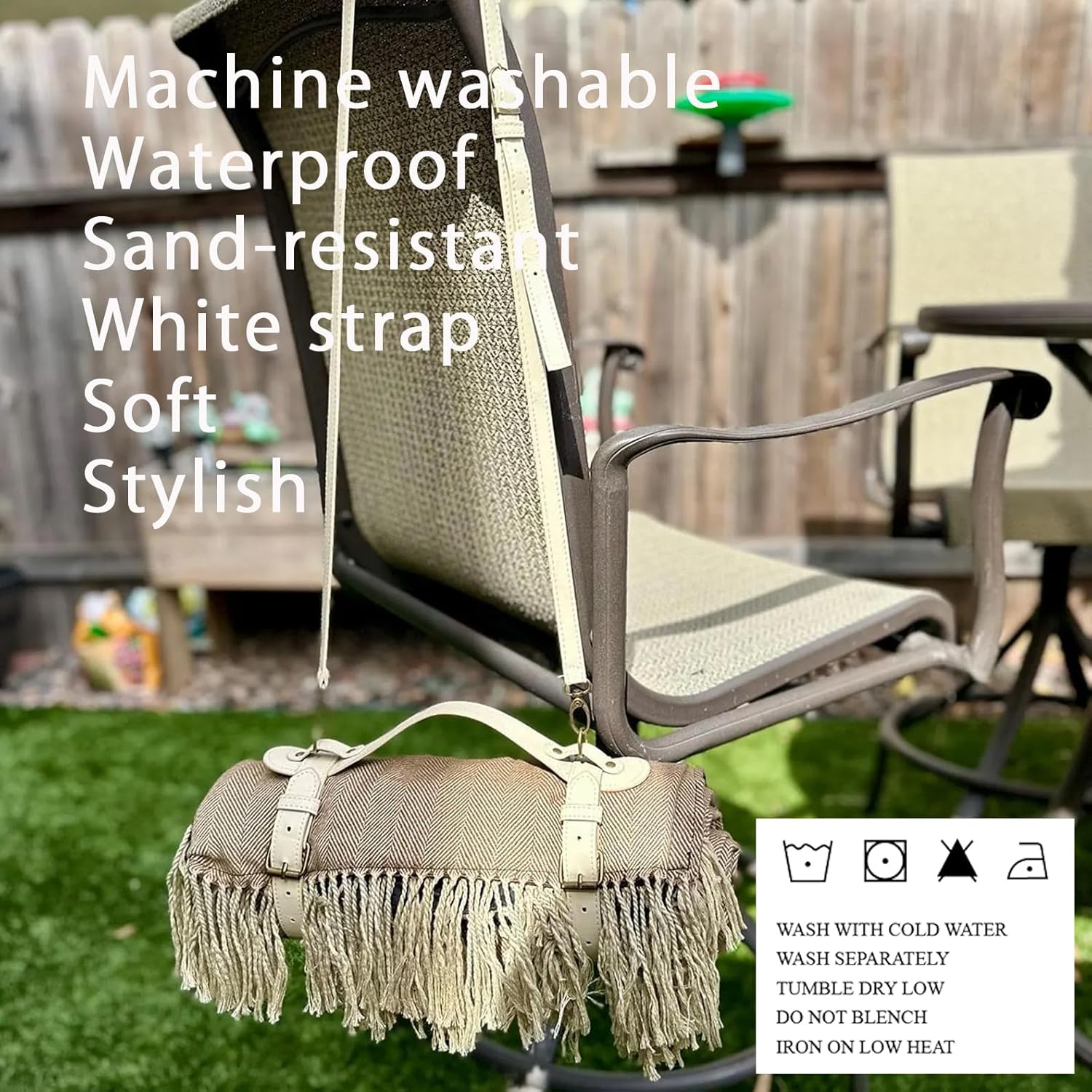 Picnic Blanket Extra Large Waterproof with Strap 59"x79" - Machine Washable Tassels Faux Wool Cashmere for Park, Grass, Camping, Hiking, Concerts (Deep Tan with white shoulder strap, 59"X79")