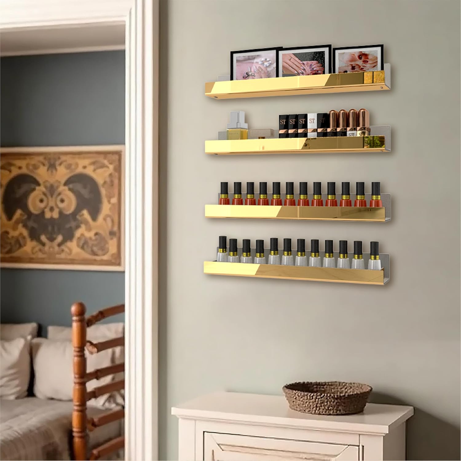 4 Pack 15 Inch Gold Reflective Acrylic Shelves, Gold Foating Shelves, Modern Sunglasses Essential Oil Picture Ledge Display Toy Storage Shelf