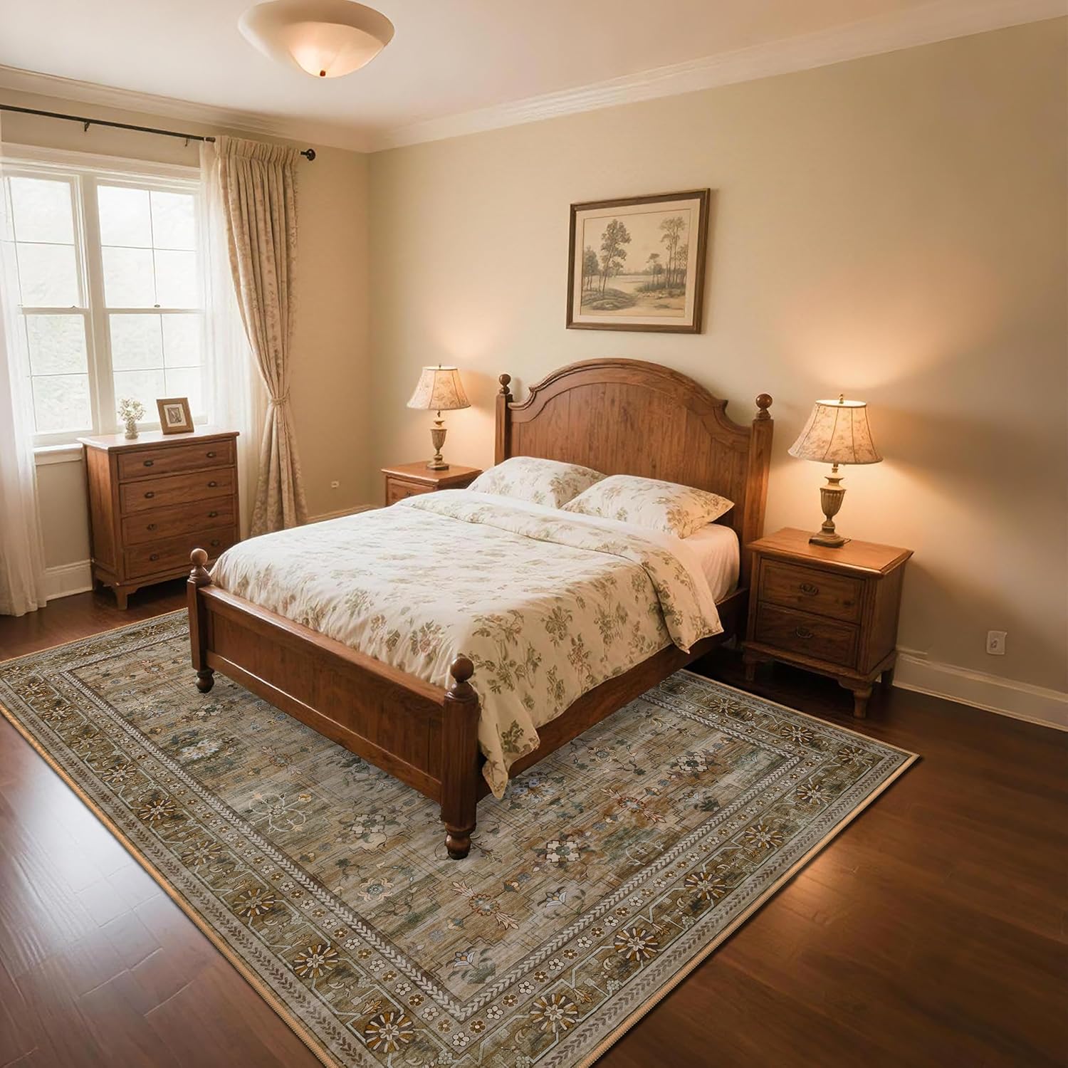 4x6 Area Rug for Bedroom Machine Washable, Non Slip Vintage Floral Kitchen Rugs for Dining Room, Low Pile Indoor Floor Print Carpet for Nursery Farmhouse Home Office Olive/Charcoal