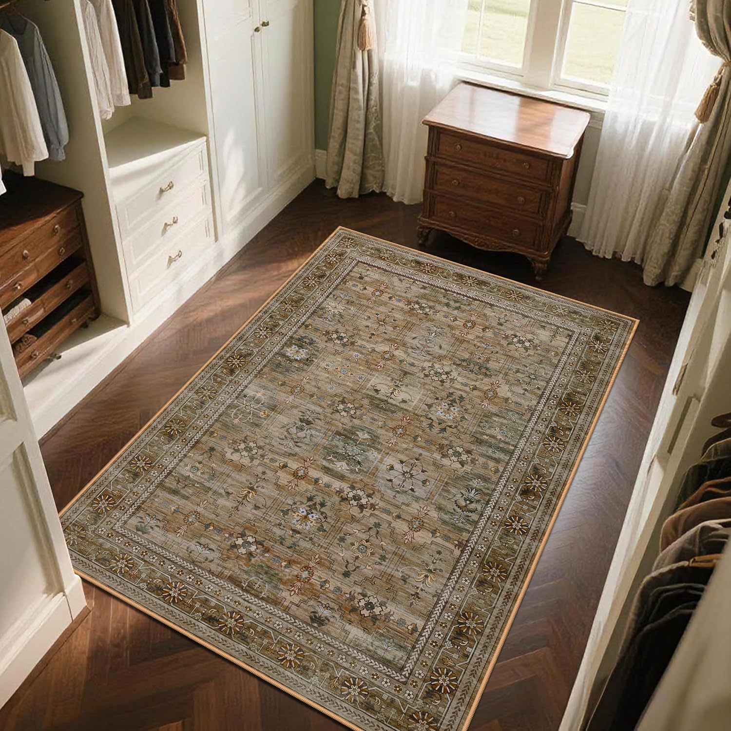 5x7 Washable Area Rug for Living Room Dining Room, Distressed Non Slip Vintage Floral Rugs for Bedroom, Traditional Indoor Floor Carpet for Dining Kitchen Farmhouse Olive/Charcoal