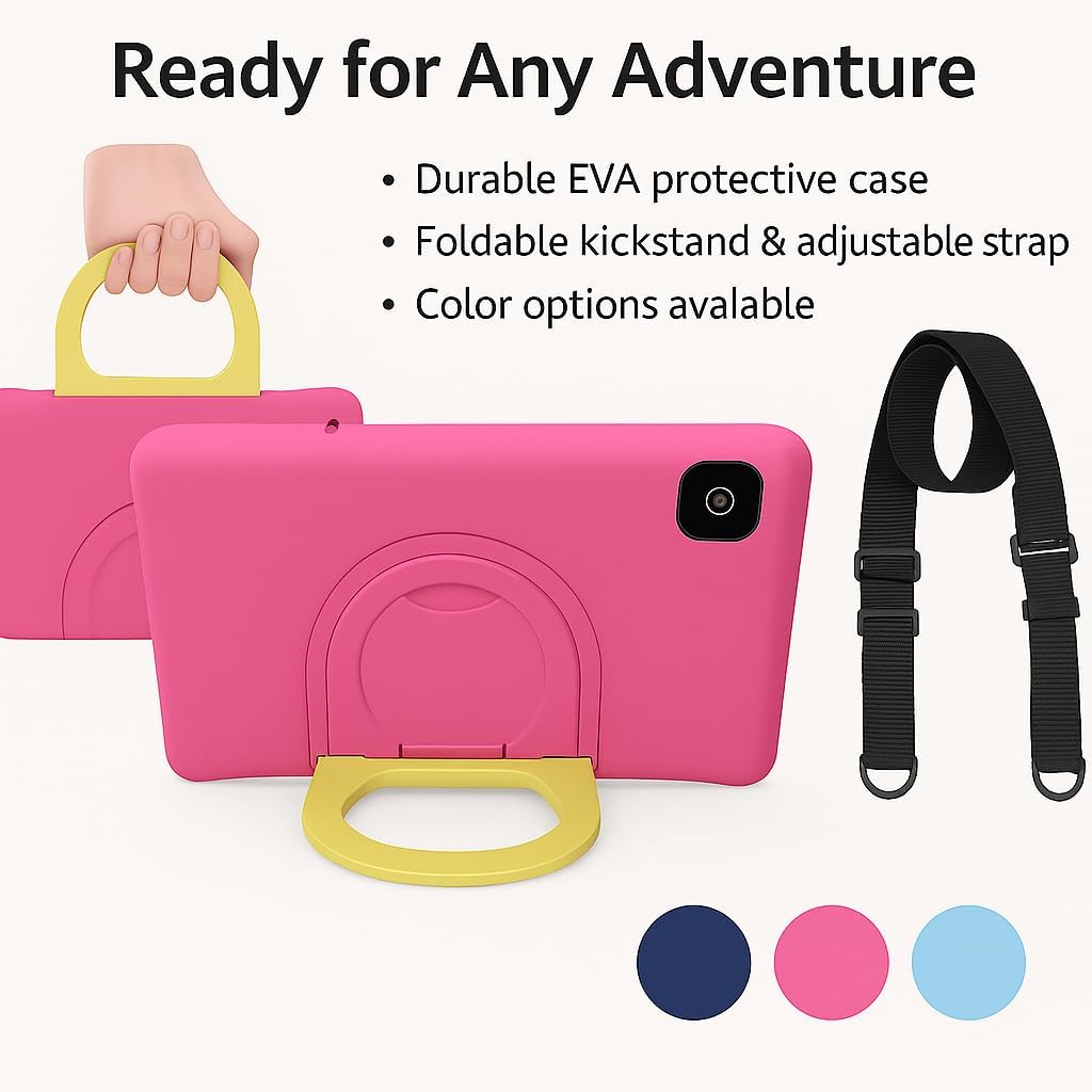 - Shockproof Case with Built-in Stand The tablet comes with a rugged, kid-proof silicone case that guards against drops and bumps. Integrated stand allows kids to watch videos or attend virtual classes without holding the device.
