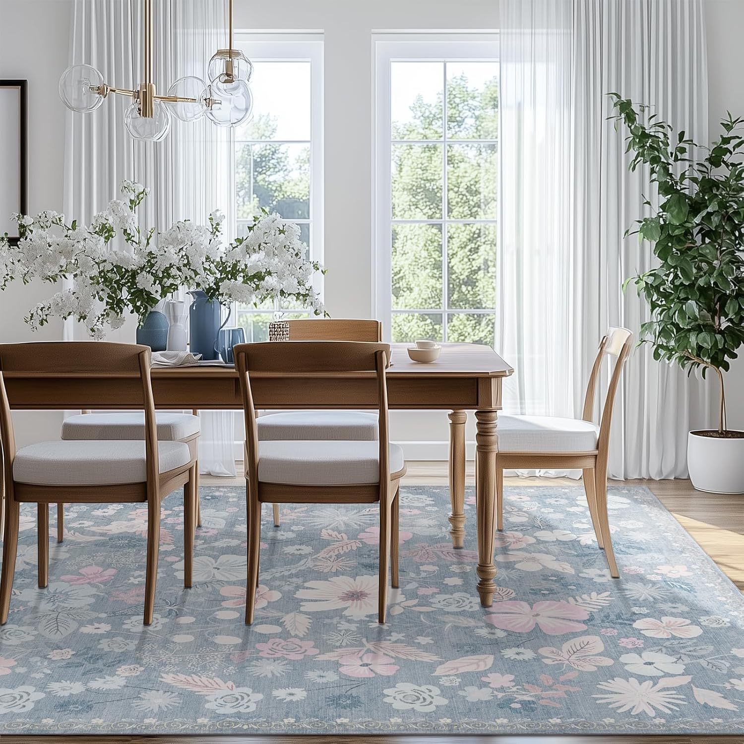 Blue Area Rugs 9x12 Living Room Floral Boho Vintage Machine Washable Area Rugs Stain Resistant Low Pile Cottage Core Carpet Rug for Bedroom Dining Room Classroom Playroom,Slate Blue