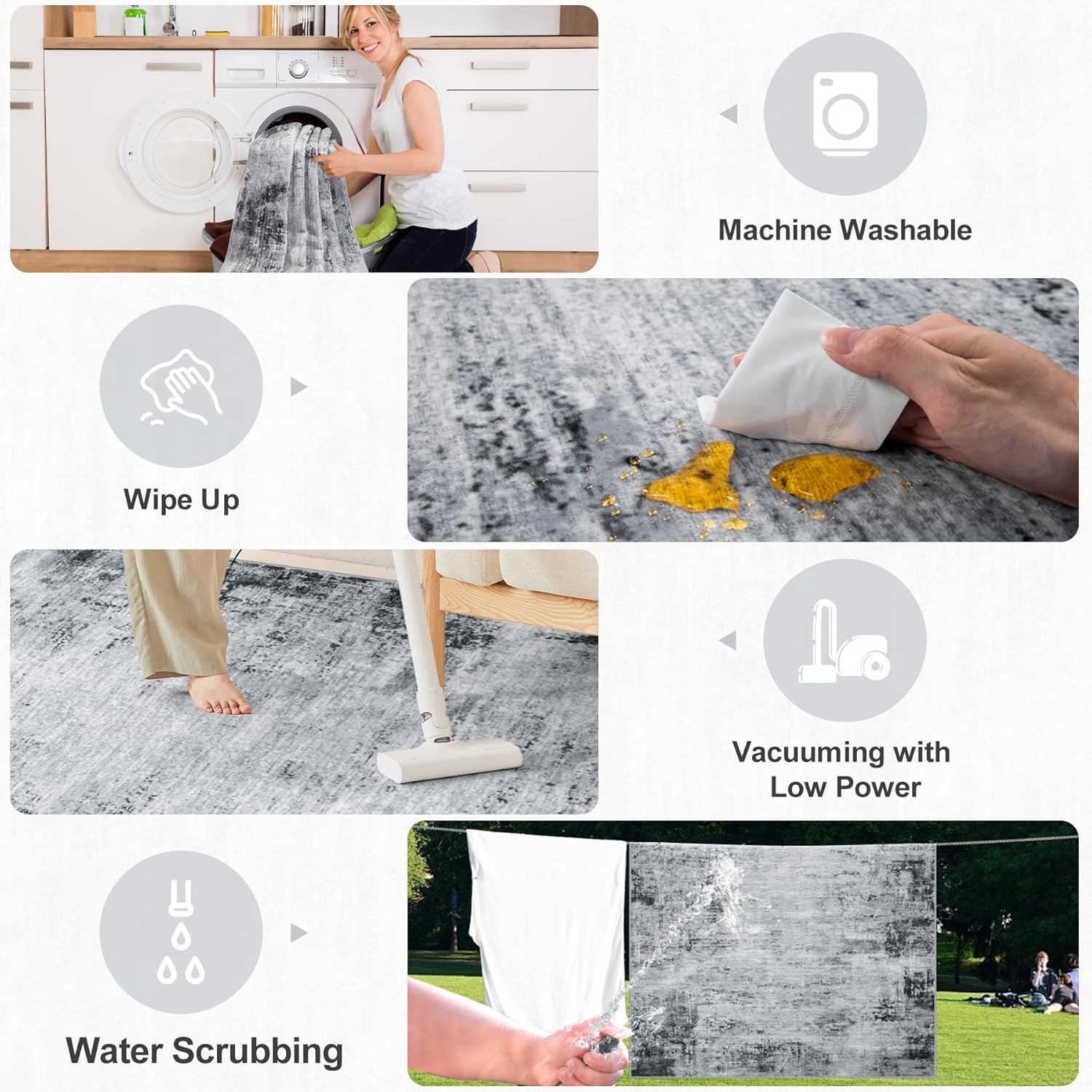 - Machine Washable Area Rug: Say goodbye to hidden dirt and cleaning hassles. The 0.2" low pile soft rug keeps most dirt on the surface, Easy to clean with a low-power vacuum cleaner.They are machine washable, and for sizes 6x9 and larger, we recommend using a commercial washing machine to restore their original beauty