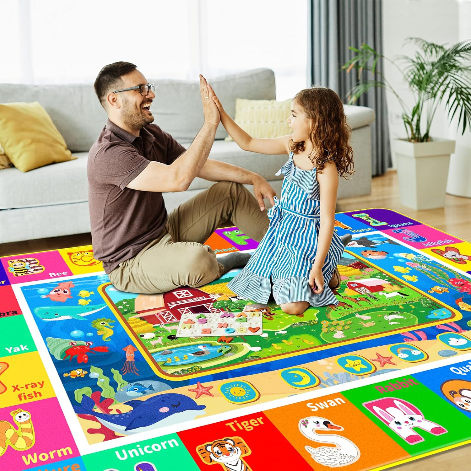 - Fun & Educational Design: Designed to engage and educate, this playroom rug introduces children to a variety of topics, including 26 alphabet and corresponding animals, farm and sea scenes, and animals. Its vibrant, eye-catching illustrations stimulate your child’s cognitive development and foster early learning through play, making it an enjoyable experience for both fun and education.