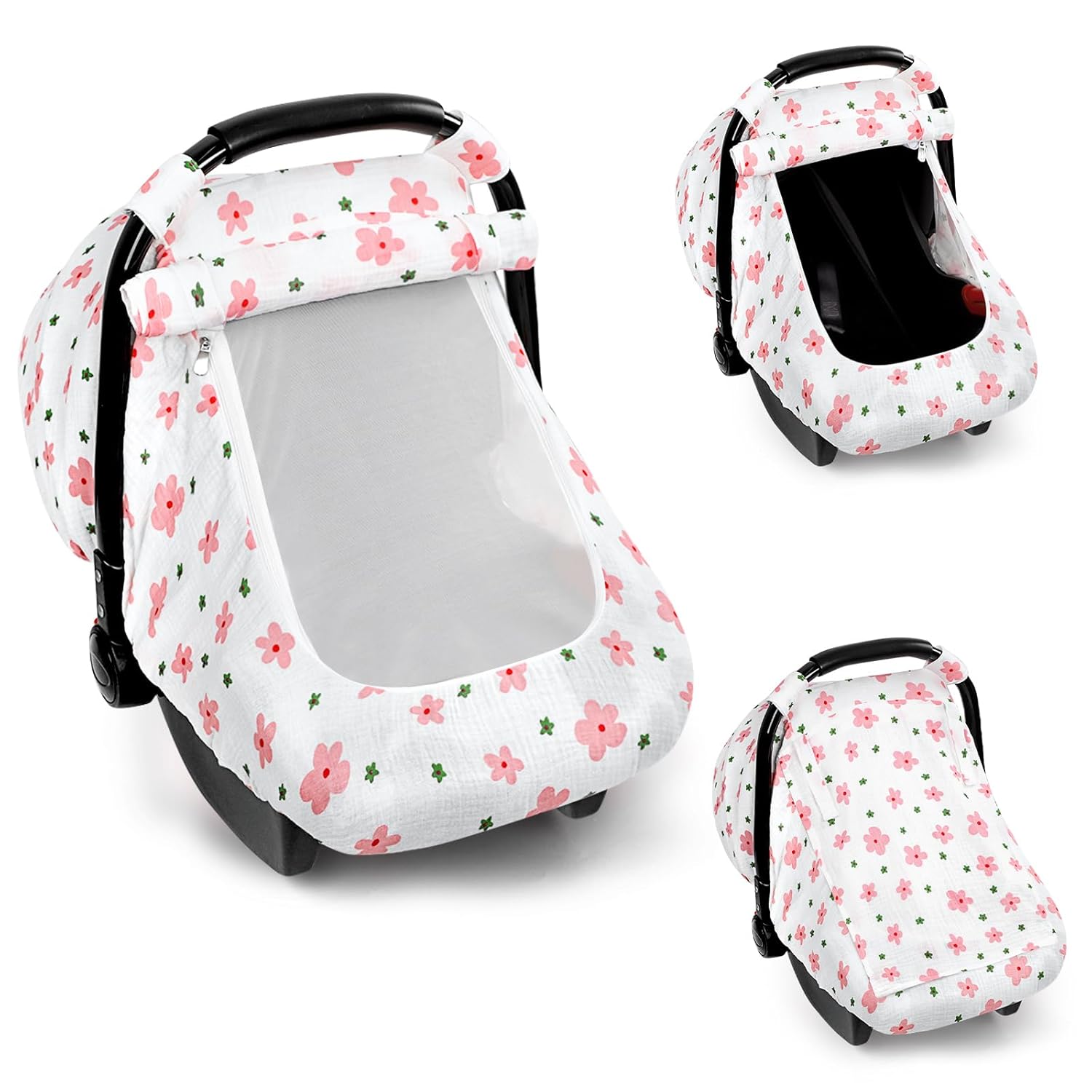 Hooyax Muslin Car Seat Cover Baby - Breathable and Privacy Car Seat Canopy with 3 Modes - Easy Install & Gift Box Packaging, Universal Fit for Infant Car Seats, Pink Flower