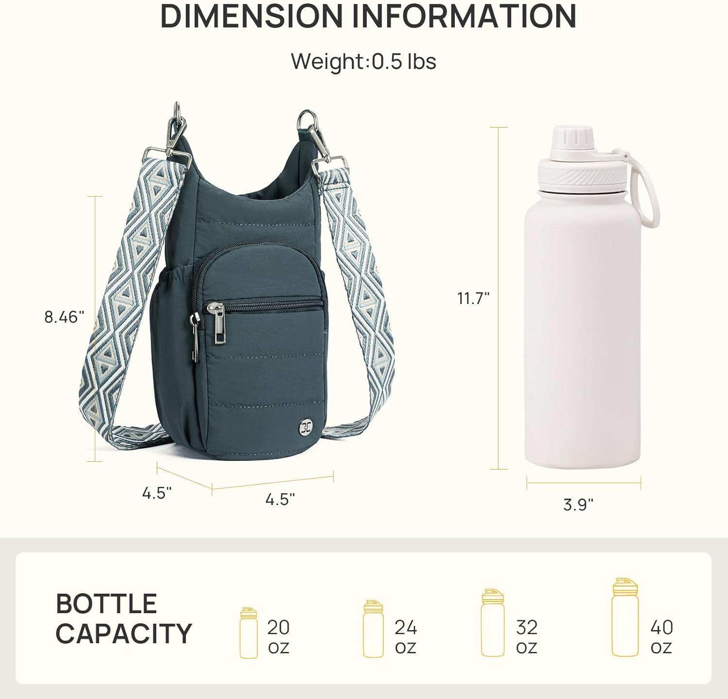 - Dimension Information: The water bottle holder with a strap measures 4.5*4.5*8.46 inches (L x W x H), which is large enough to accommodate 40-ounce or smaller water bottles without side handles. Please note that when your water bottle is less than 40 ounces, the space in this water bottle bag will be relatively large, and your water bottle may shake while walking.