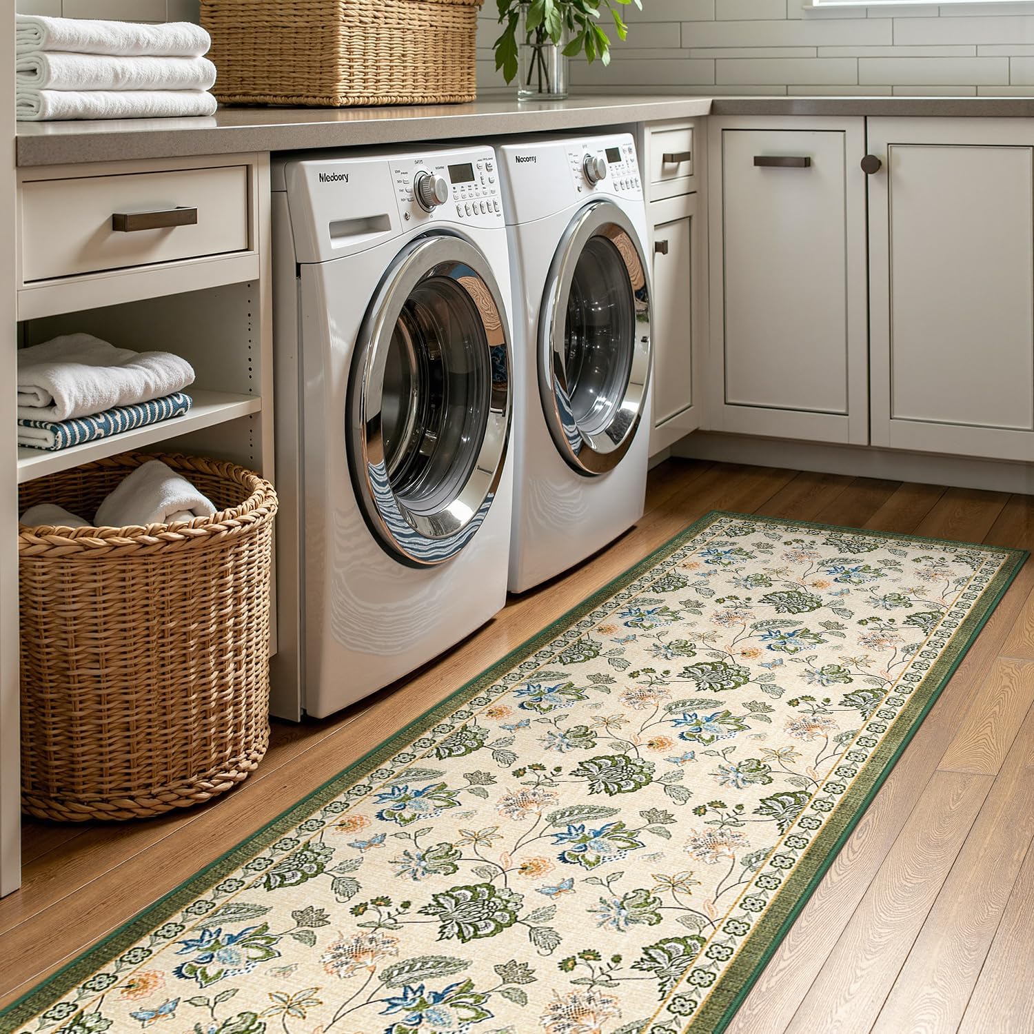 jinchan 3x8 Floral Runner Rug for Hallway Washable Kitchen Runner Vintage Romance Design Non Slip Thin Indoor Floor Cover Low-Profile Throw Carpet for Entryway Bathroom Bedroom Porch, Green/Beige