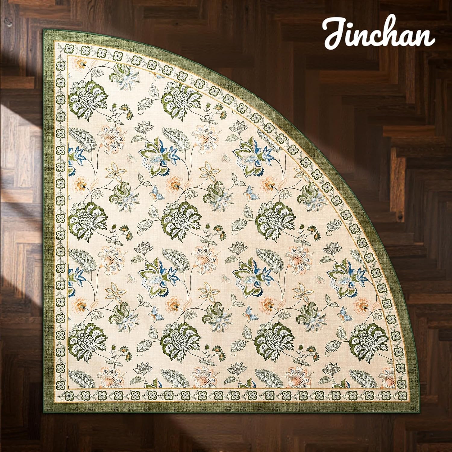 jinchan Floral Corner Rug for Living Room Washable Bedroom Rug Vintage Romance Design Non Slip Quarter Circle Lightweight Low-Pile Throw Carpet for Reading Nook Playroom,7ft Radius, Green/Beige